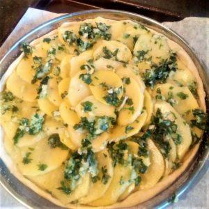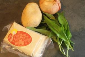 Hacher l’oignon, l’ail des ours, ajouter la moitié aux pommes de terre et mélanger.