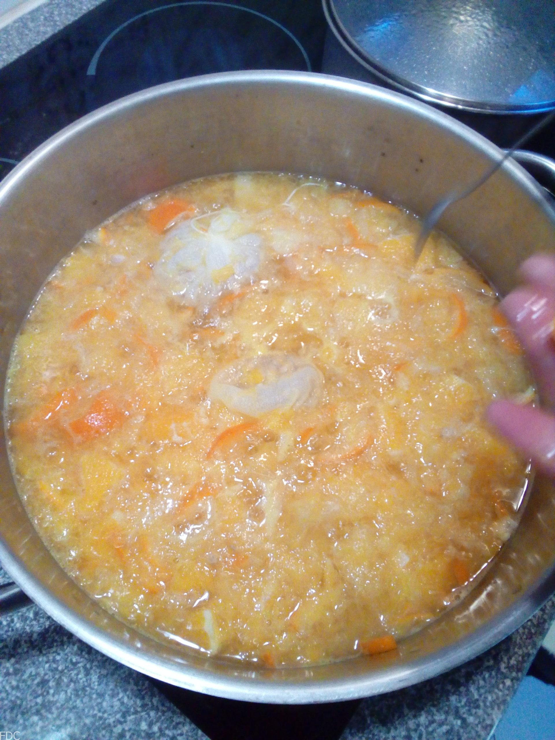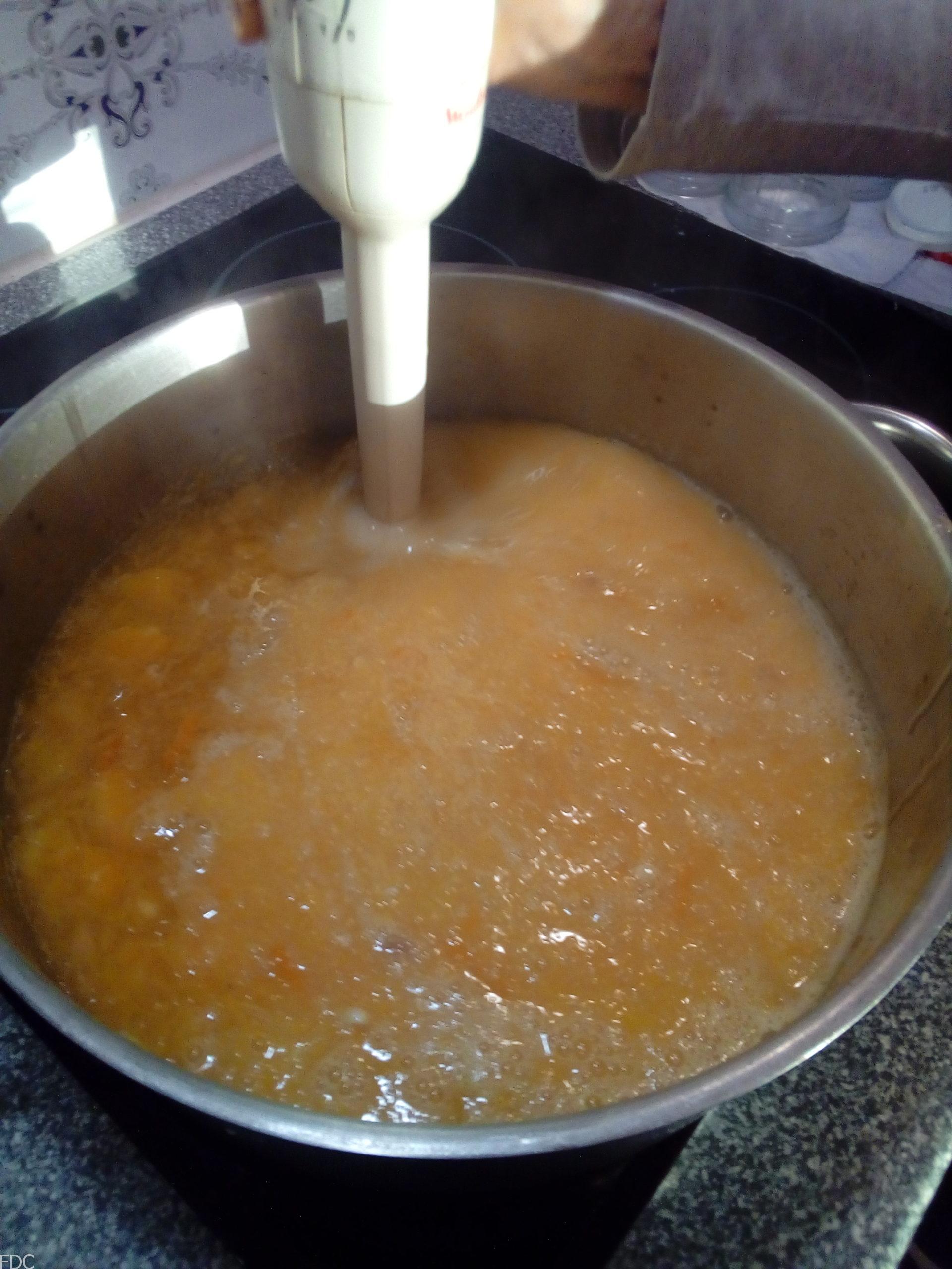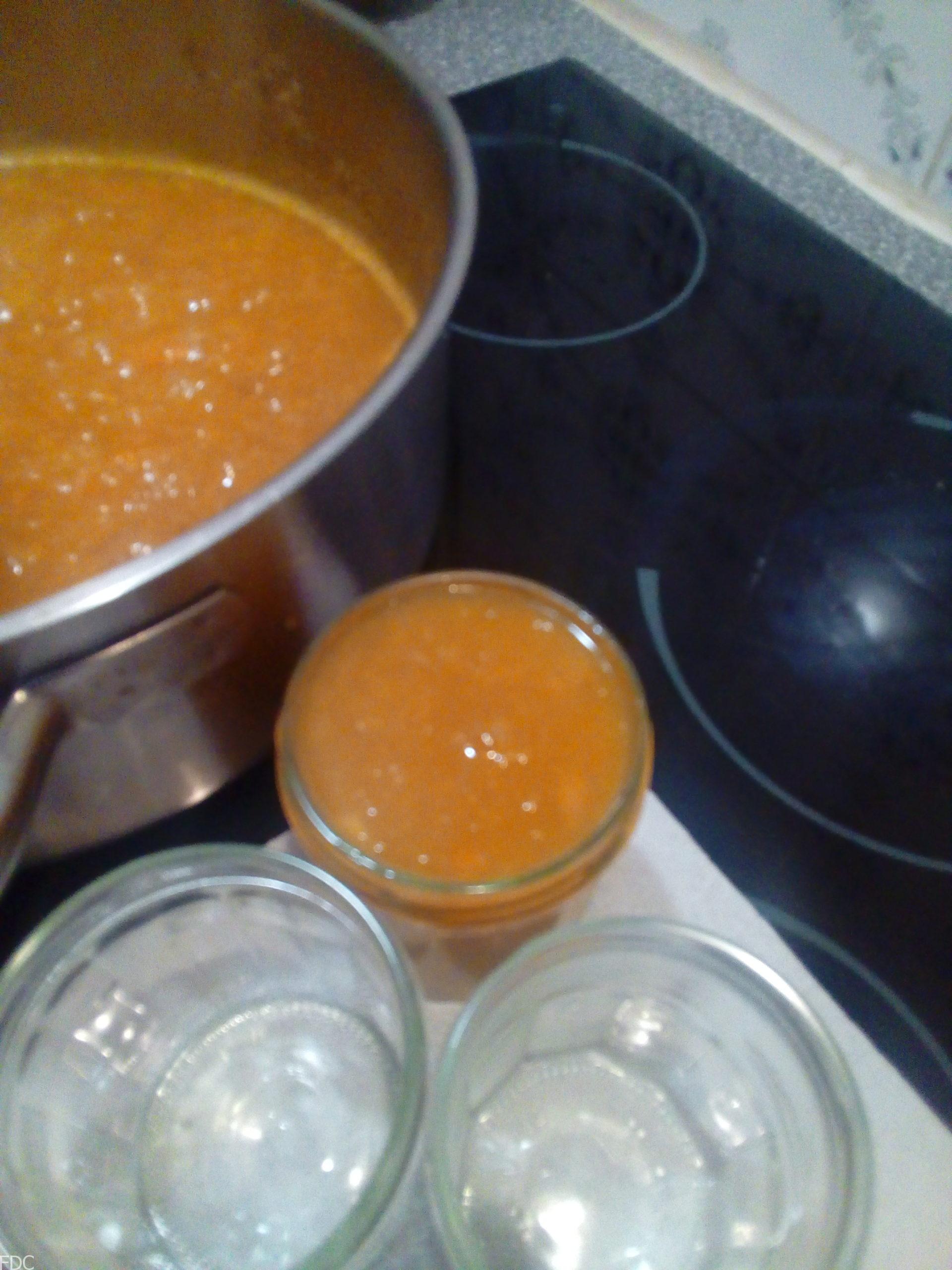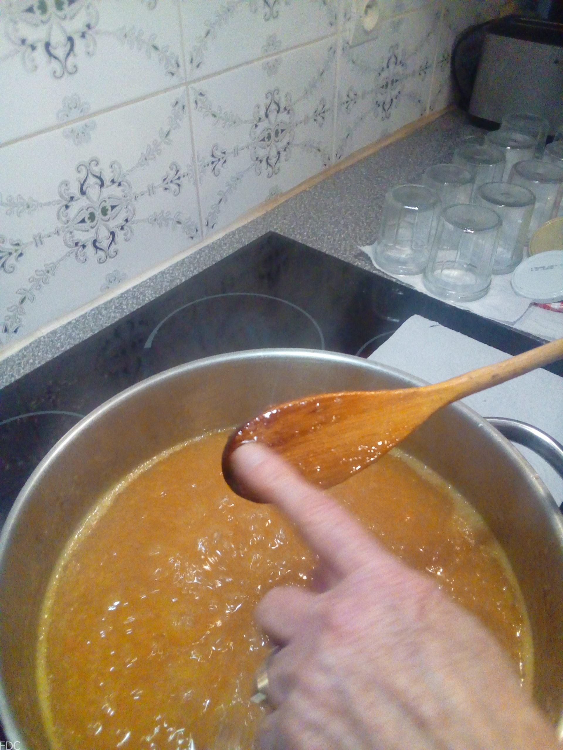 Astuce :  Pour savoir si la marmelade est cuite. En début d’ébullition une écume se forme et la couleur est claire. Au fil de la cuisson la couleur passe à l’or clair puis l’or brun et l’écume disparait progressivement. A ce moment faire le test de la cuillère bois (photo).