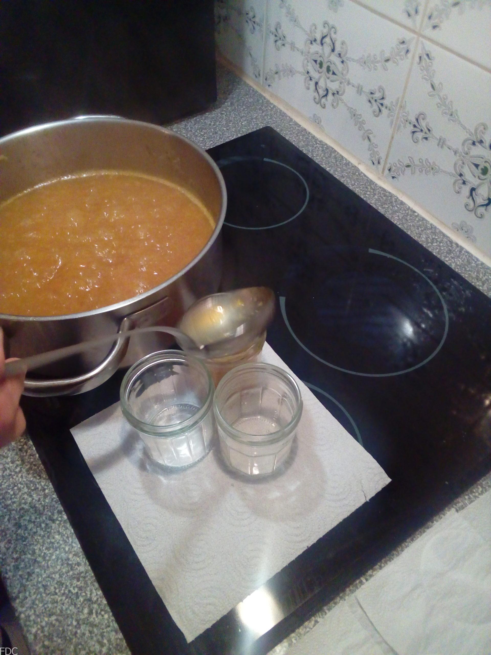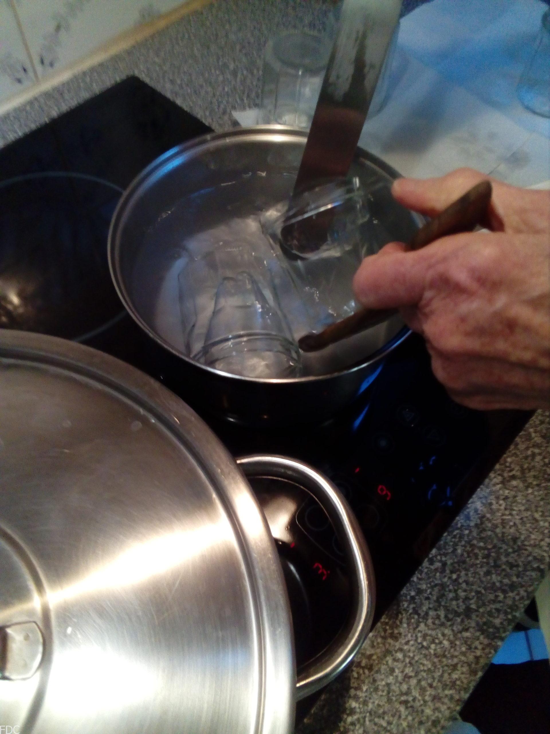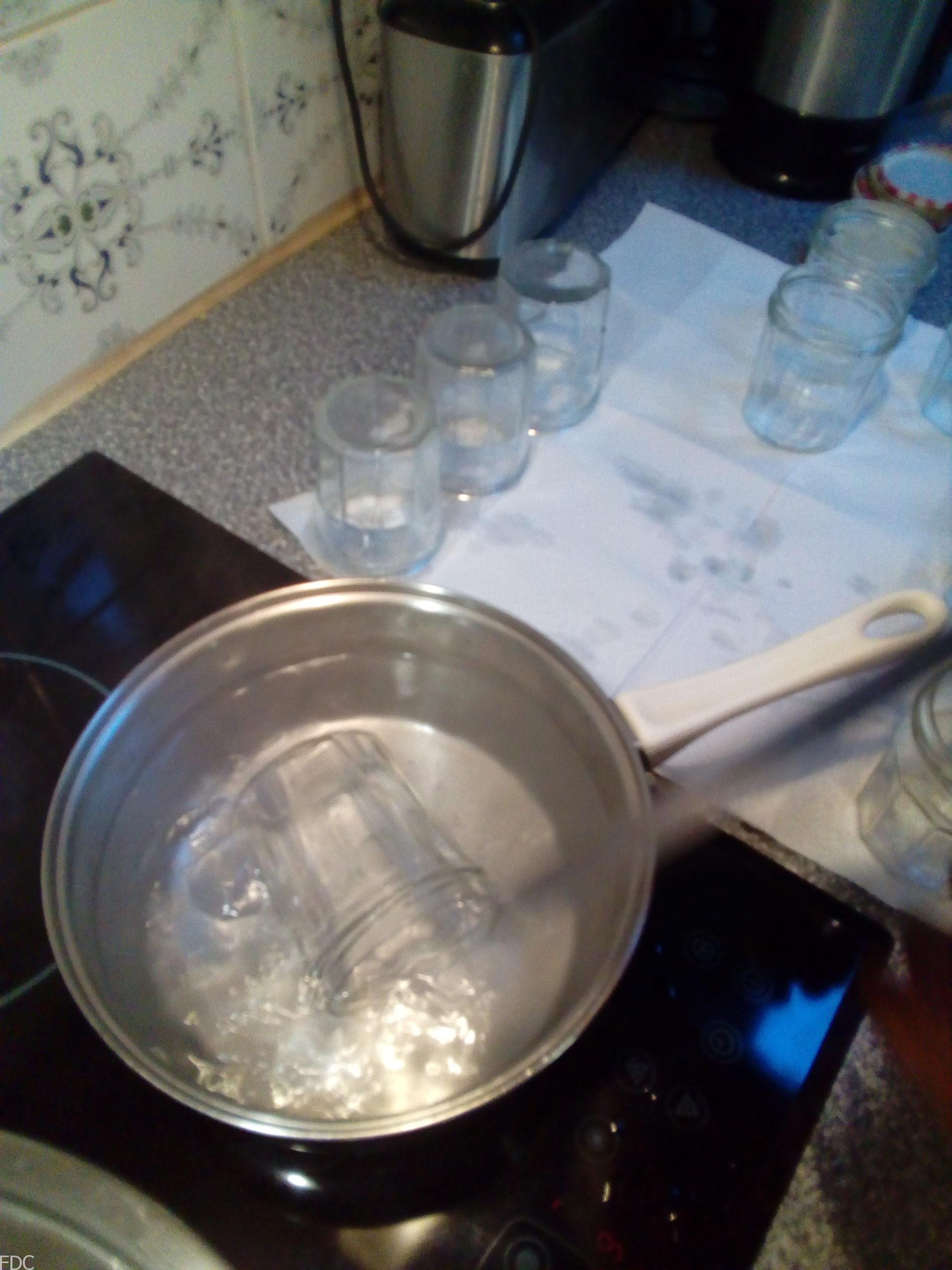 Pendant la cuisson préparez vos pots et les couvercles.  Ebouillantez-les et retournez les sur un torchon proche ou papier absorbant afin de les égoutter.