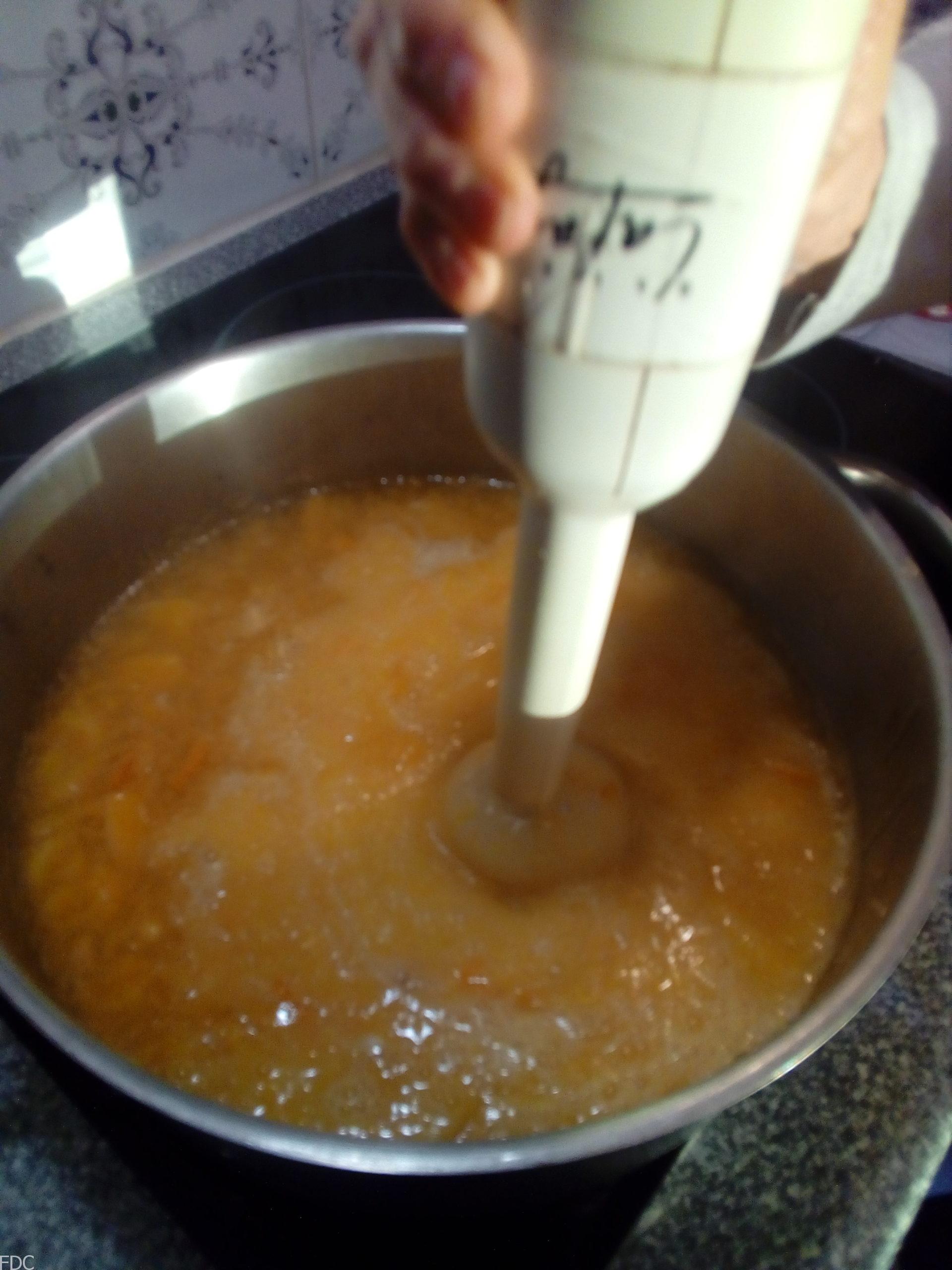 Mixez les fruits afin de réduire en purée la pulpe et garder les zestes en tout petits morceaux.