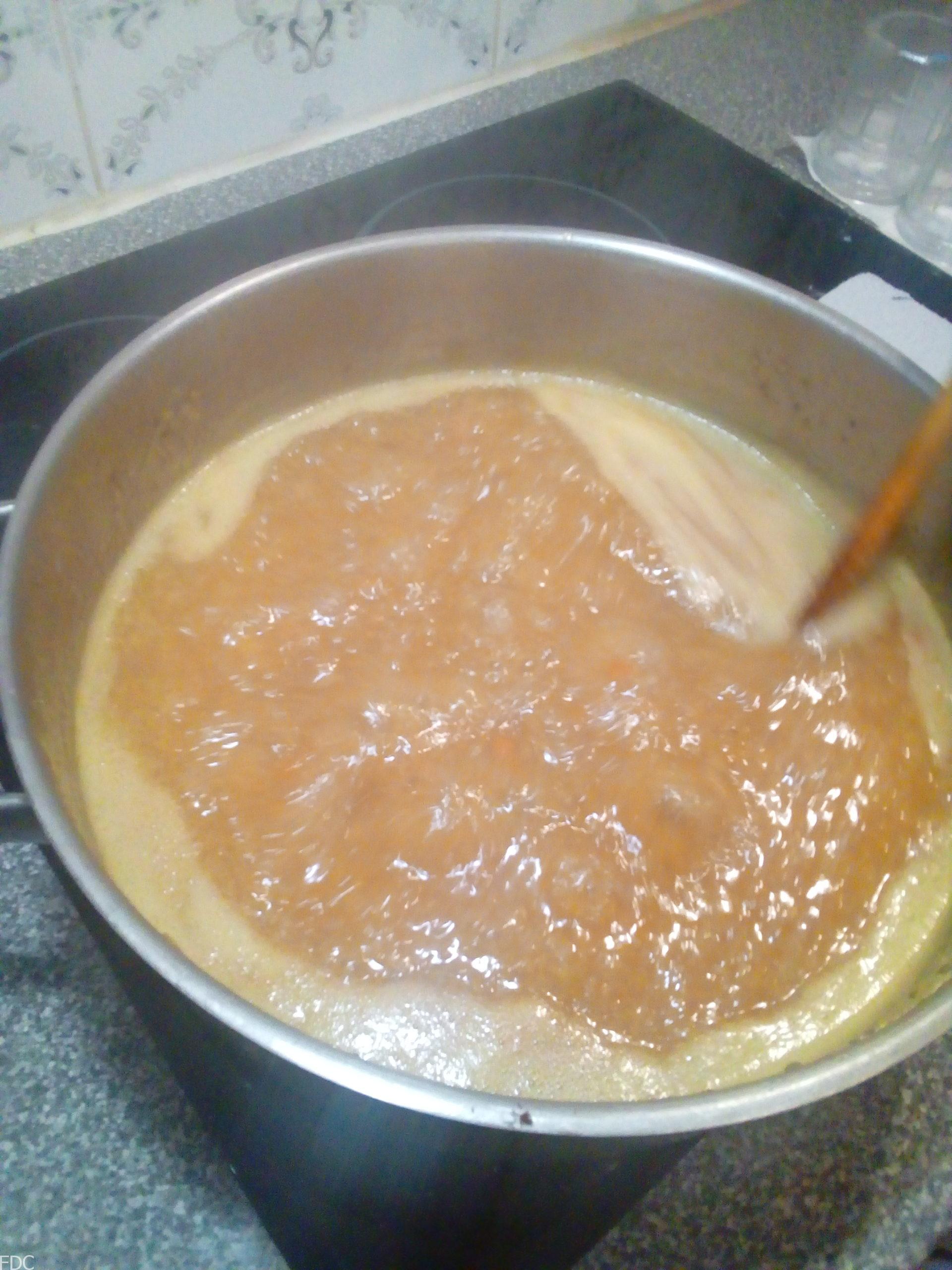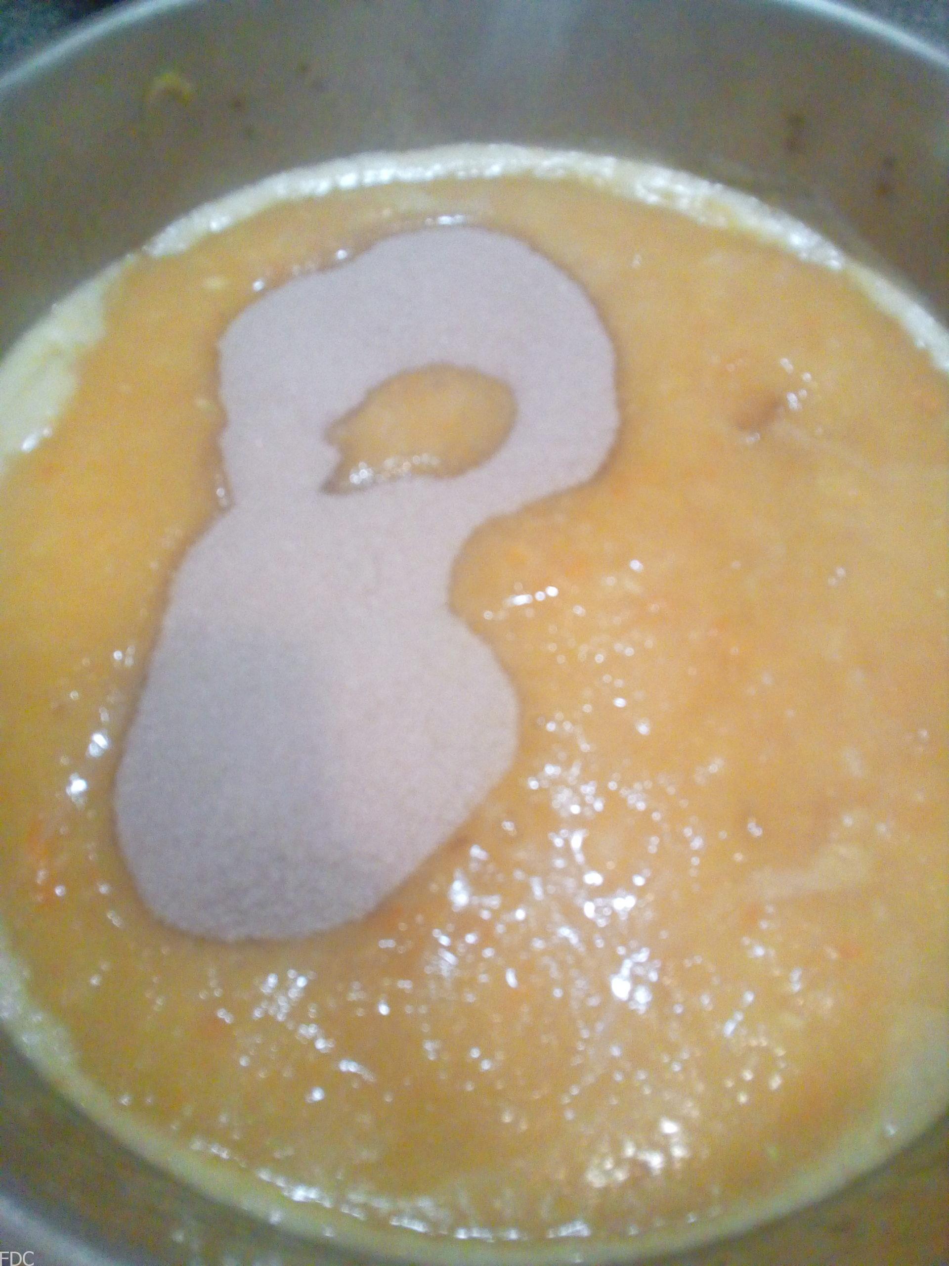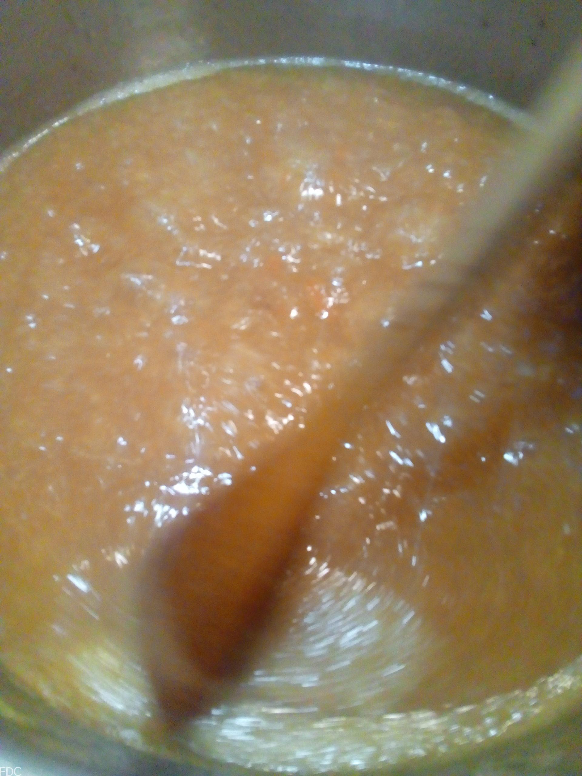 Remettre en cuisson à ébullition et remuer continuellement, la consistance doit devenir plus sirupeuse .