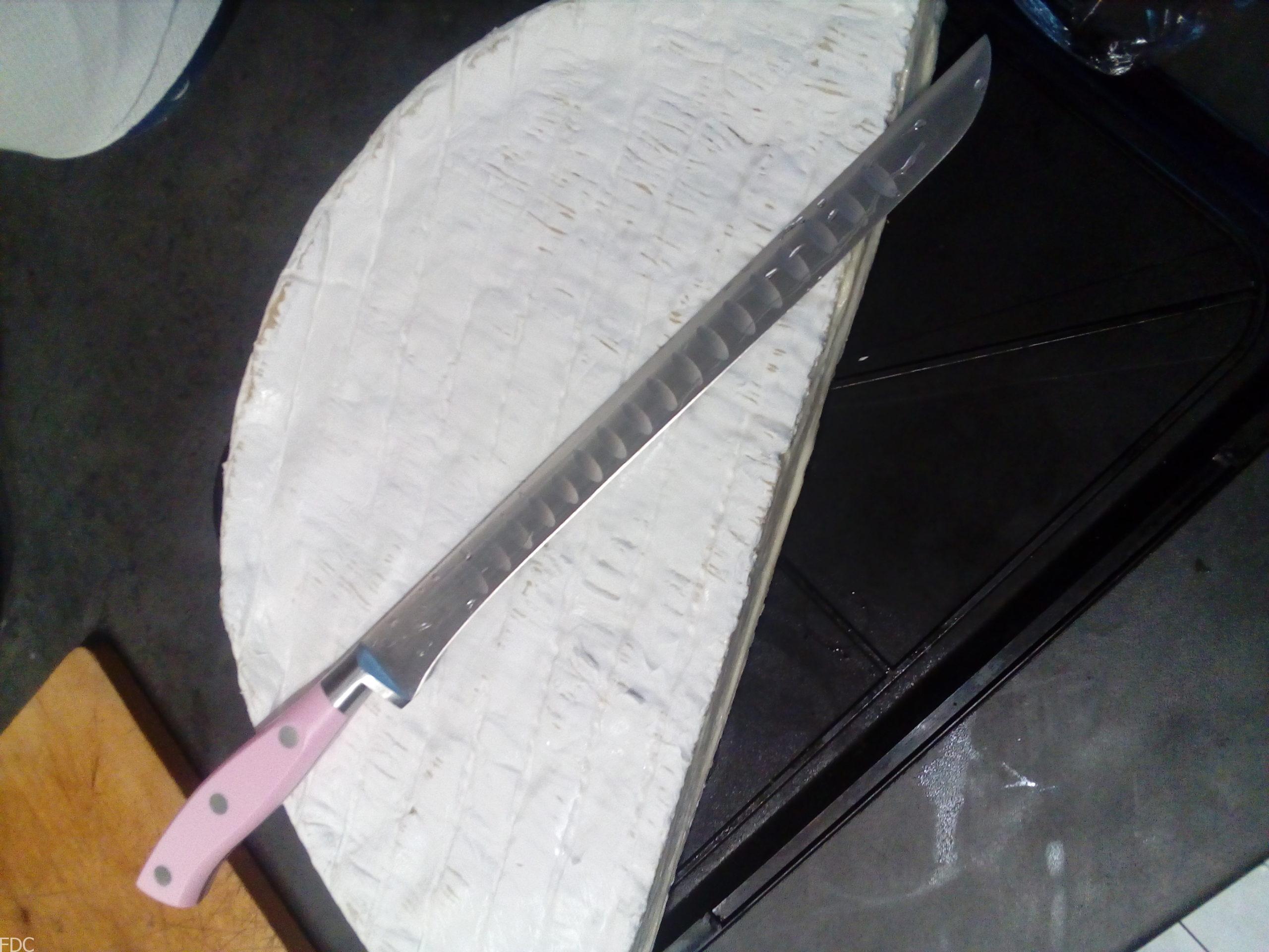 Munissez-vous d’un couteau avec une lame longue et fine pour trancher au centre dans l’épaisseur votre fromage. Ce n’est pas compliqué mais prenez votre temps afin d’avoir une découpe équilibrée.