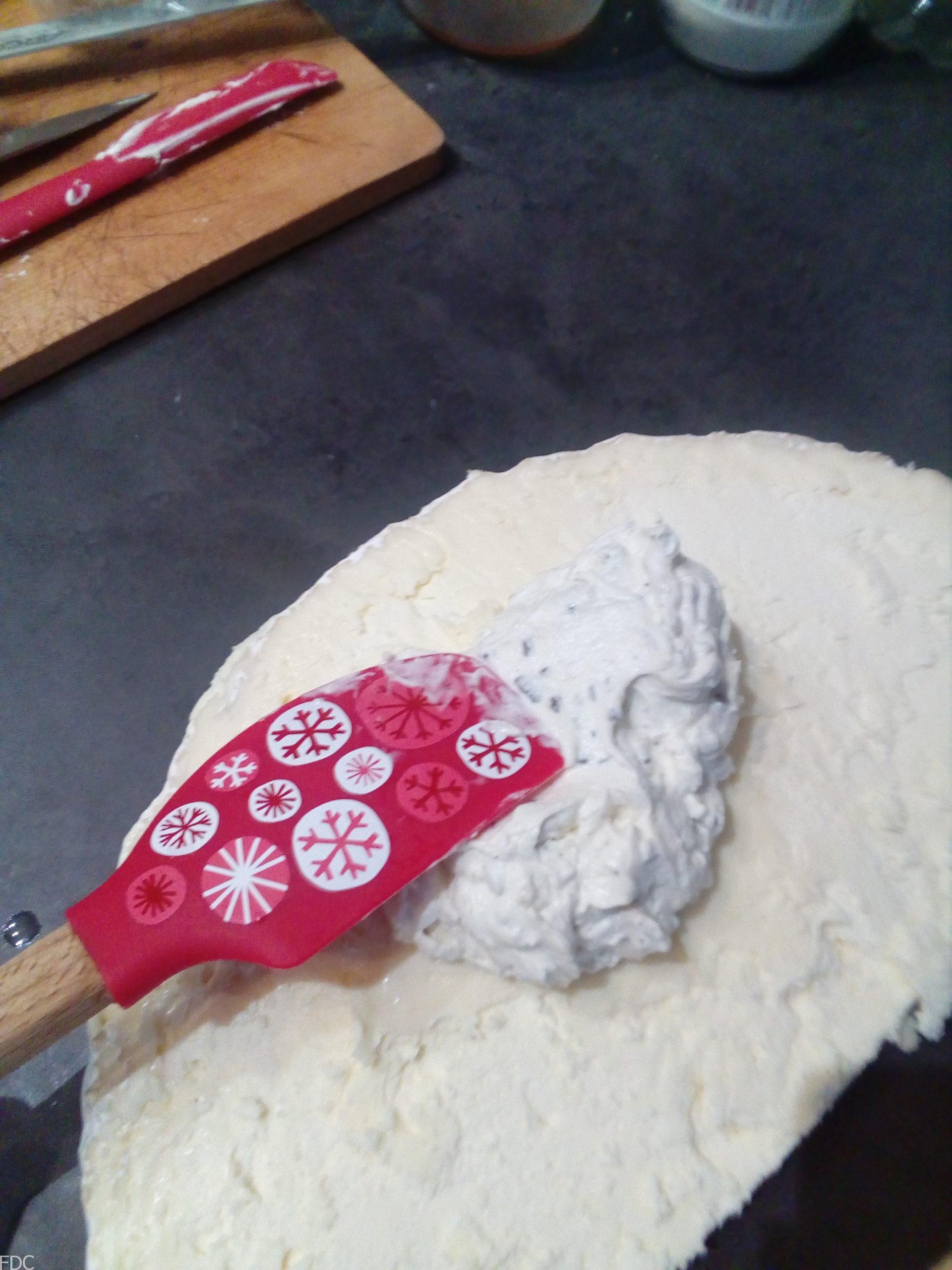 Etalez la crème truffée régulièrement sur une moitié du fromage sans en mettre trop près du bord.