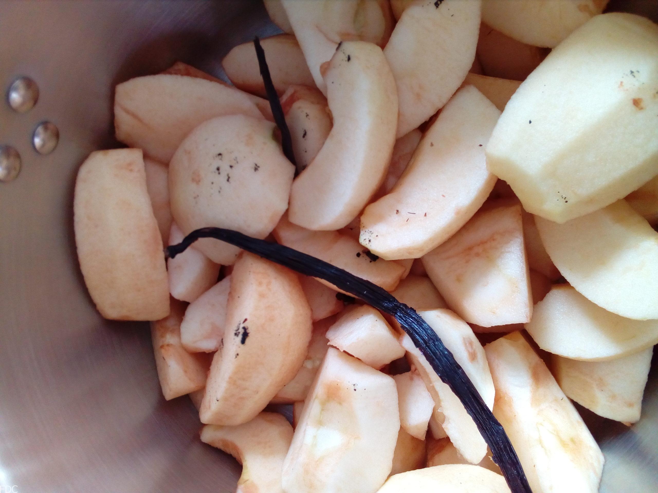 Réalisez la compote de pomme sans sucre avec 5 des 7 pommes. Dans une casserole mettez les morceaux de pommes épluchées et vidées avec la gousse de vanille fendue dans la longueur. Démarrer la cuisson assez forte pour créer une caramélisation et ensuite baisser le feu et laisser cuire doucement en remuant de temps à autres.