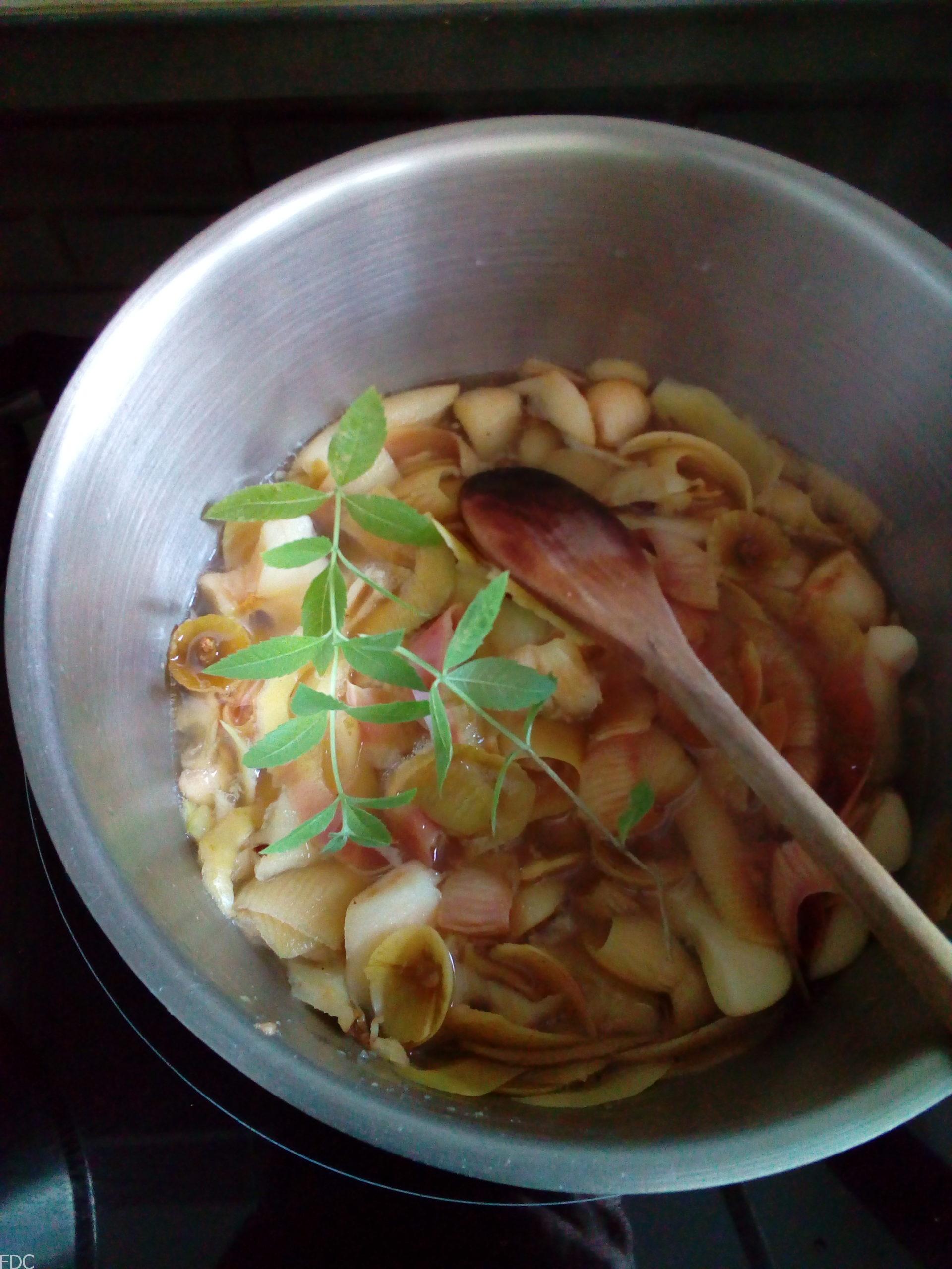 Pendant ce temps mettez les épluchures et les cœurs à cuire avec 50 cl d’eau à feu moyen. Couvrez et mélangez de temps à autre.