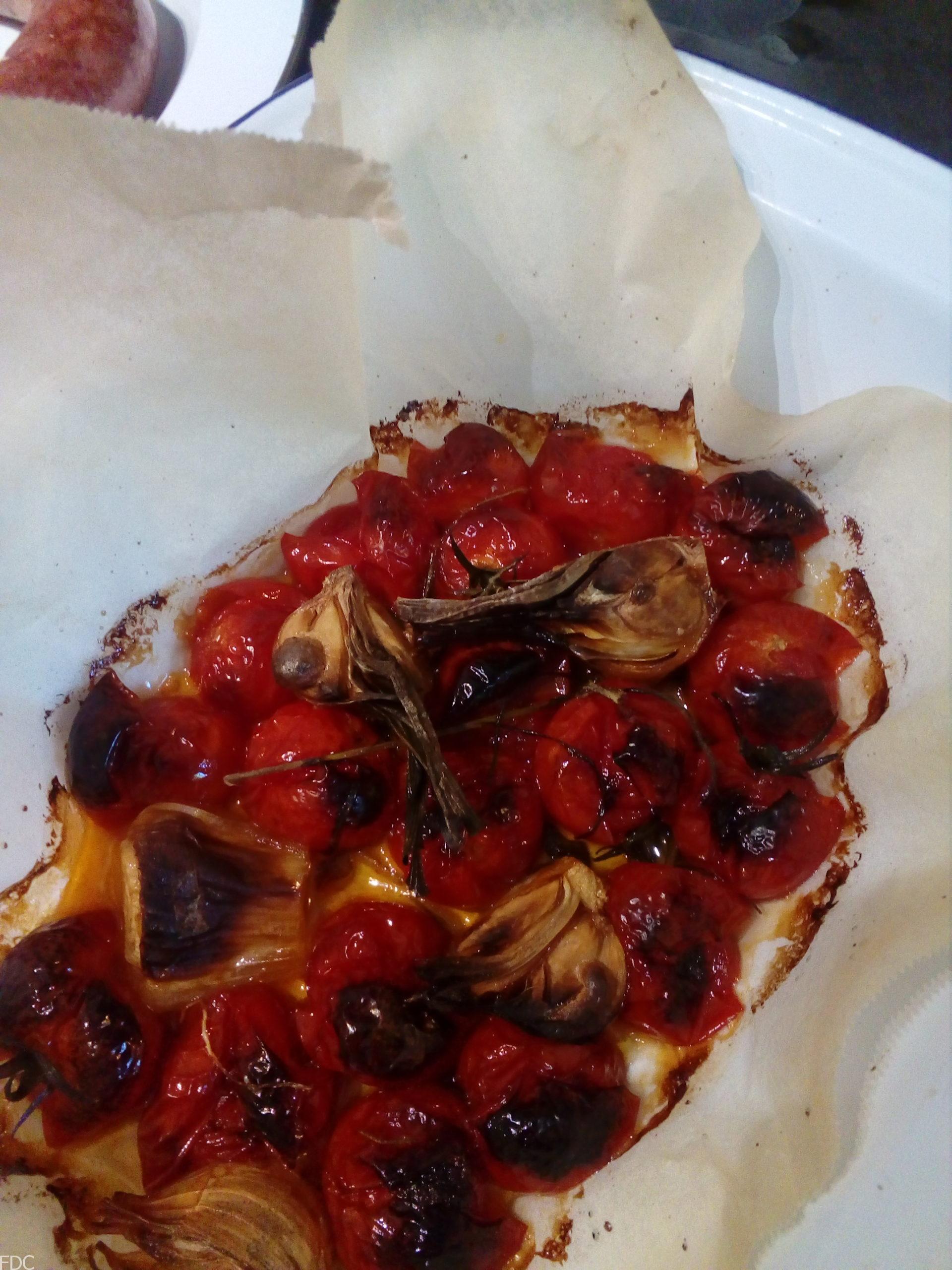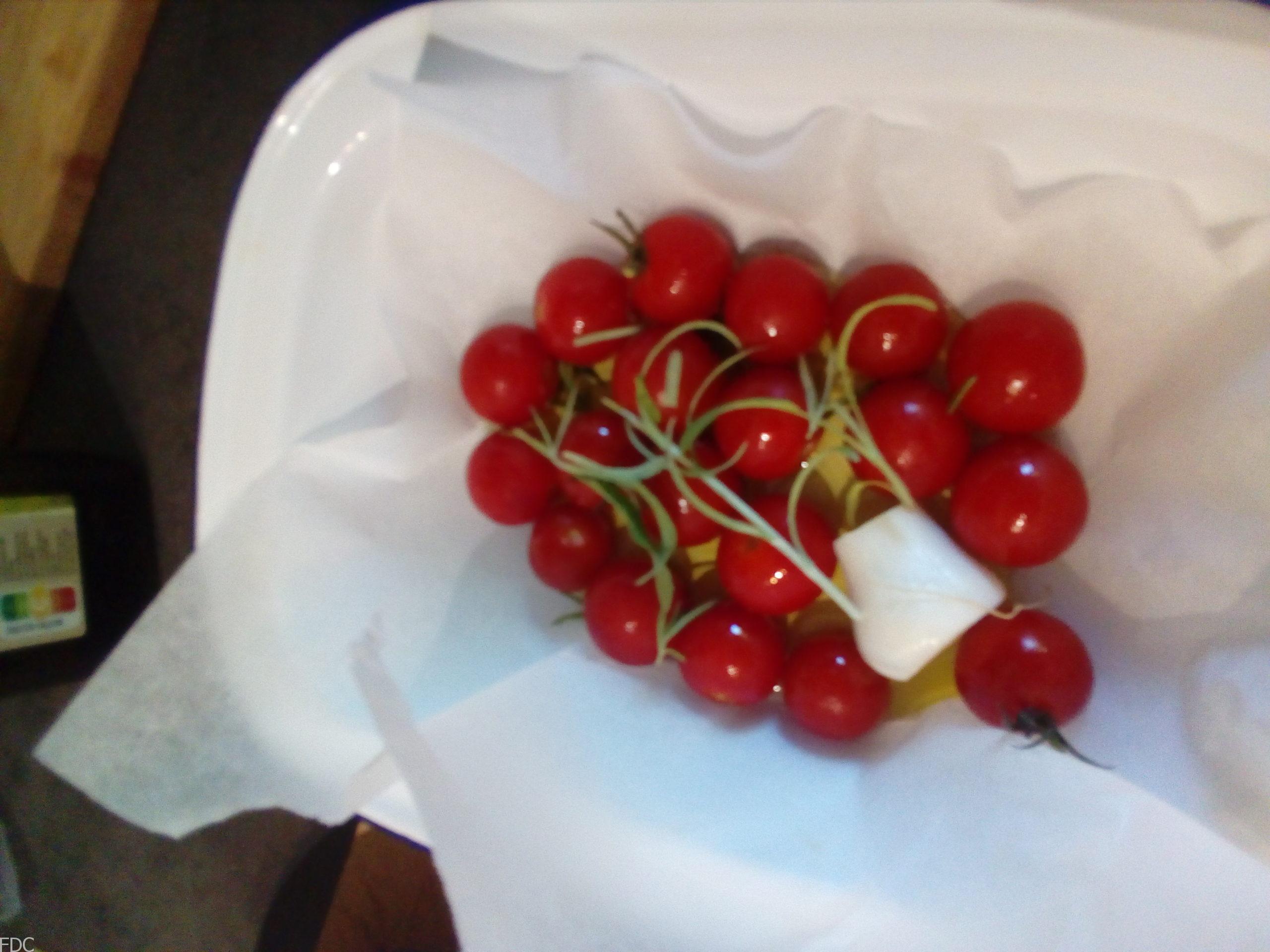 Mettez vos tomates cerises à confire au four à 180° dans une plaque avec de l’huile d’olive, des herbes, une tête d’il coupée en quatre et des oignons blancs durant 30 minutes.