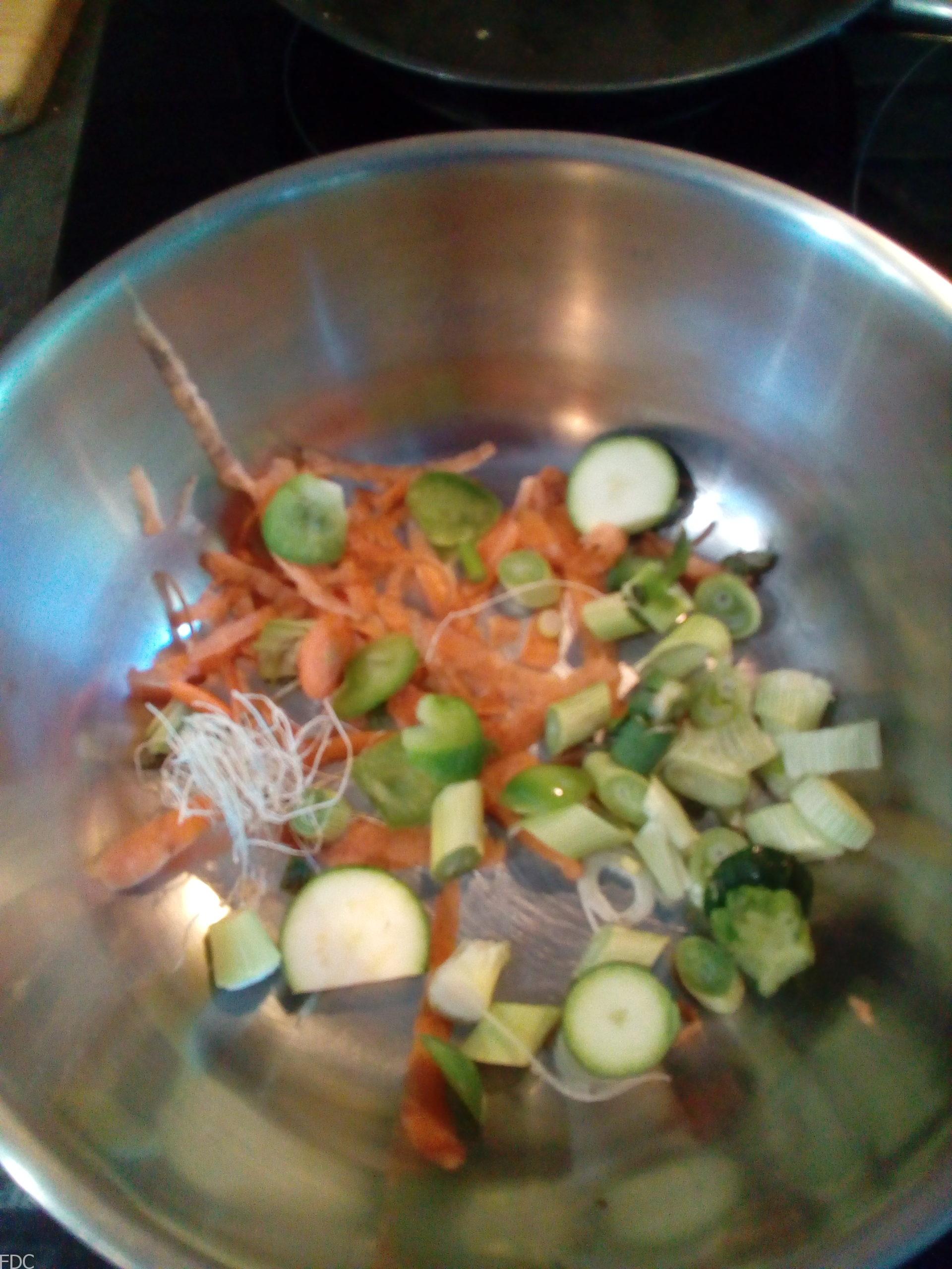 Dans un wok ou sauteuse, faites saisir vos légumes (carottes et poivrons), réservez, ensuite idem pour les courgettes sans les cuire.