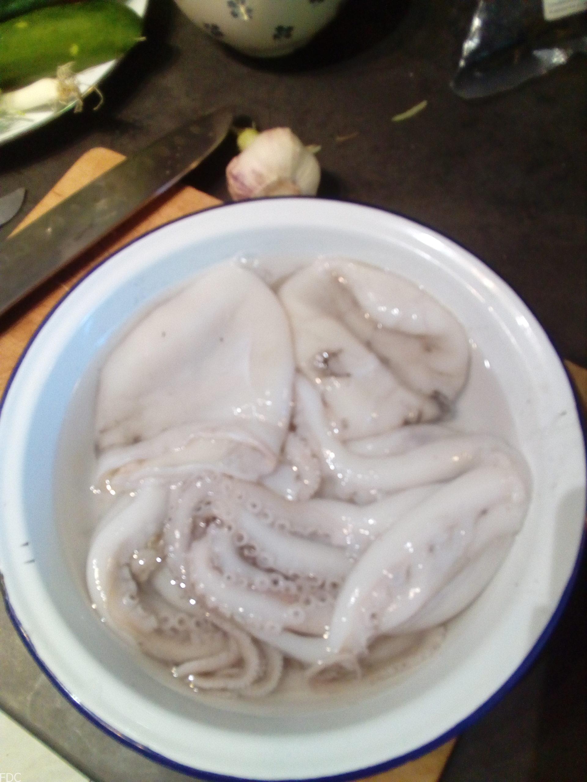 Préparez vos poulpes, enlevez délicatement les entrailles en espérant que vous n’ayez pas la poche d’encre. Enlevez la première peau (grise) et réservez.