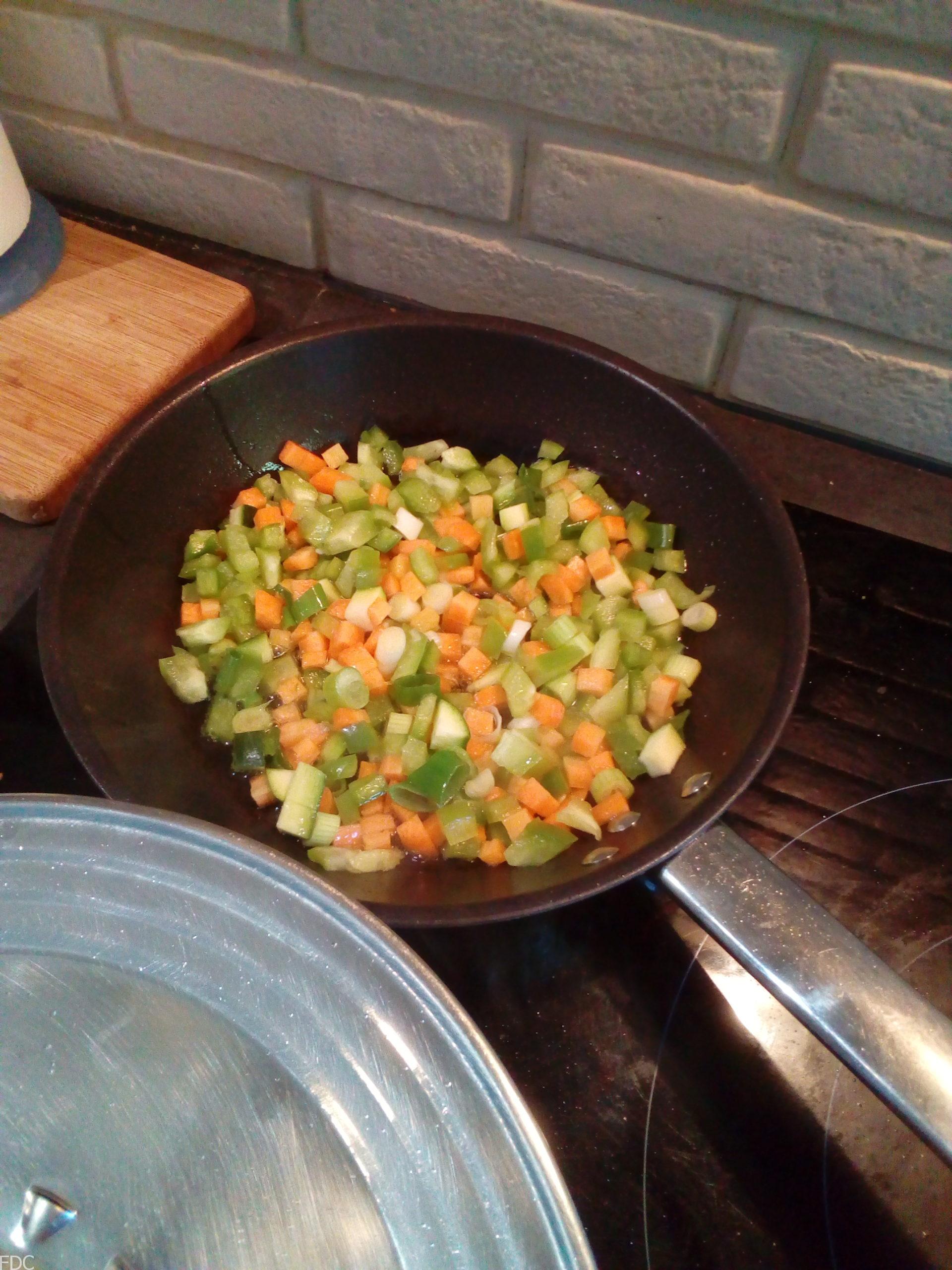 Taillez en paysanne, les carottes, poivrons, courgettes (mettre à part) et écossez vos petits pois.