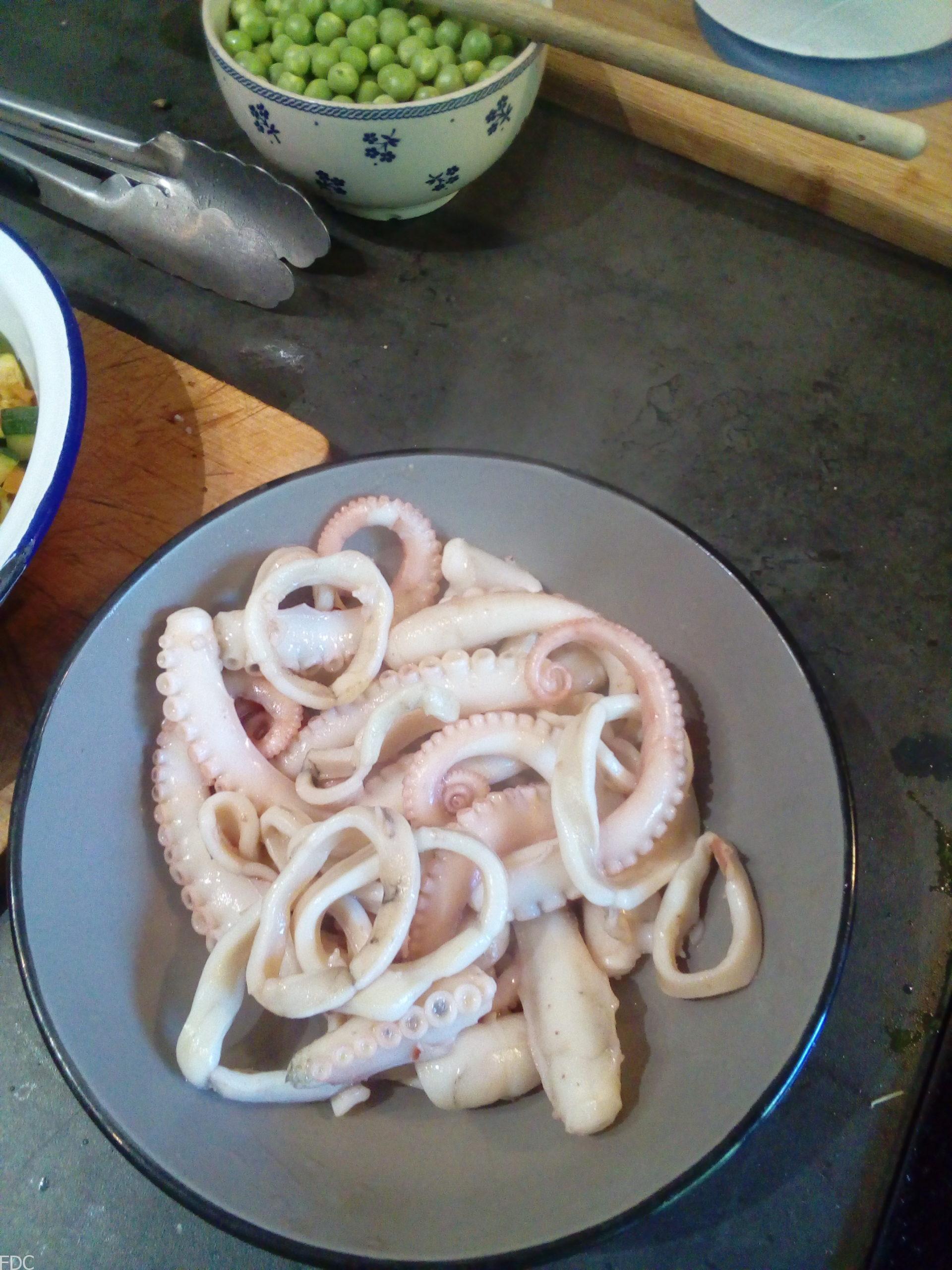 Poulpe ou calamar : 600 g (demandez à votre poissonnier de les préparer). Je préfère le poulpe au calamar pour le goût. Choisissez des petits.