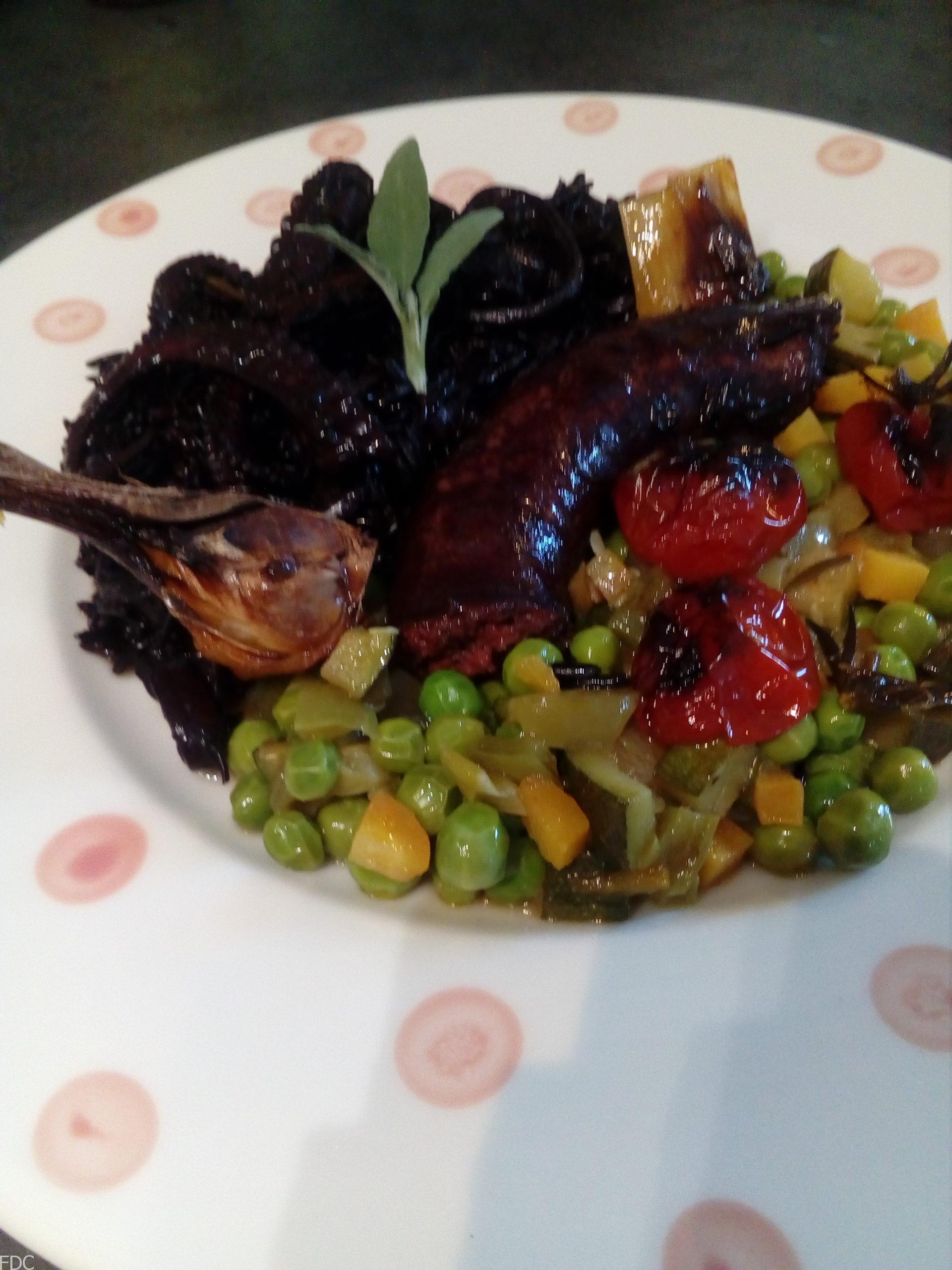 J’utilise le riz noir de Camargue pour sa typicité mais aussi pour le rappel de couleur du taureau de Camargue. Ensuite les légumes aux couleurs vertes et rouges Nîmes.