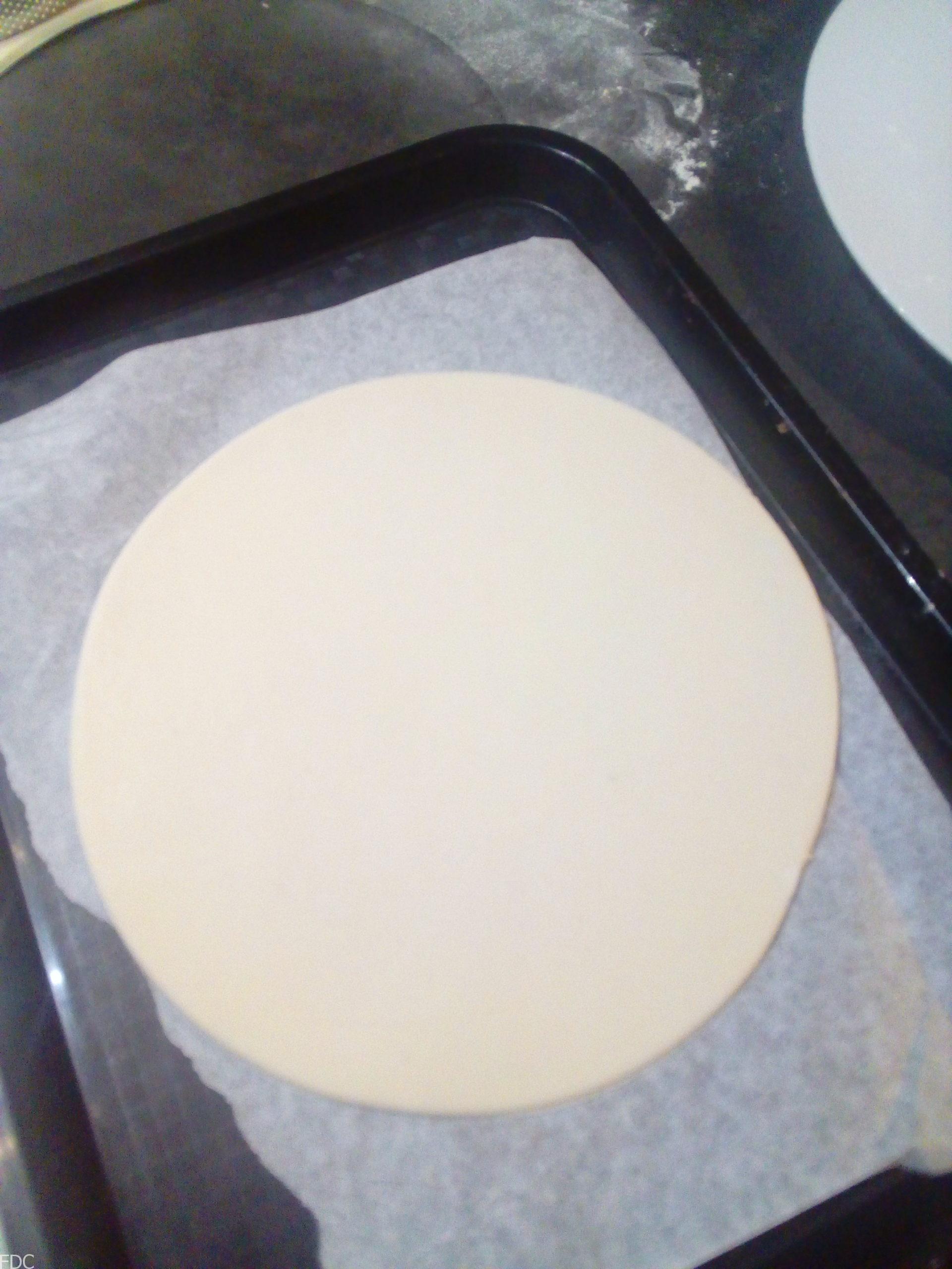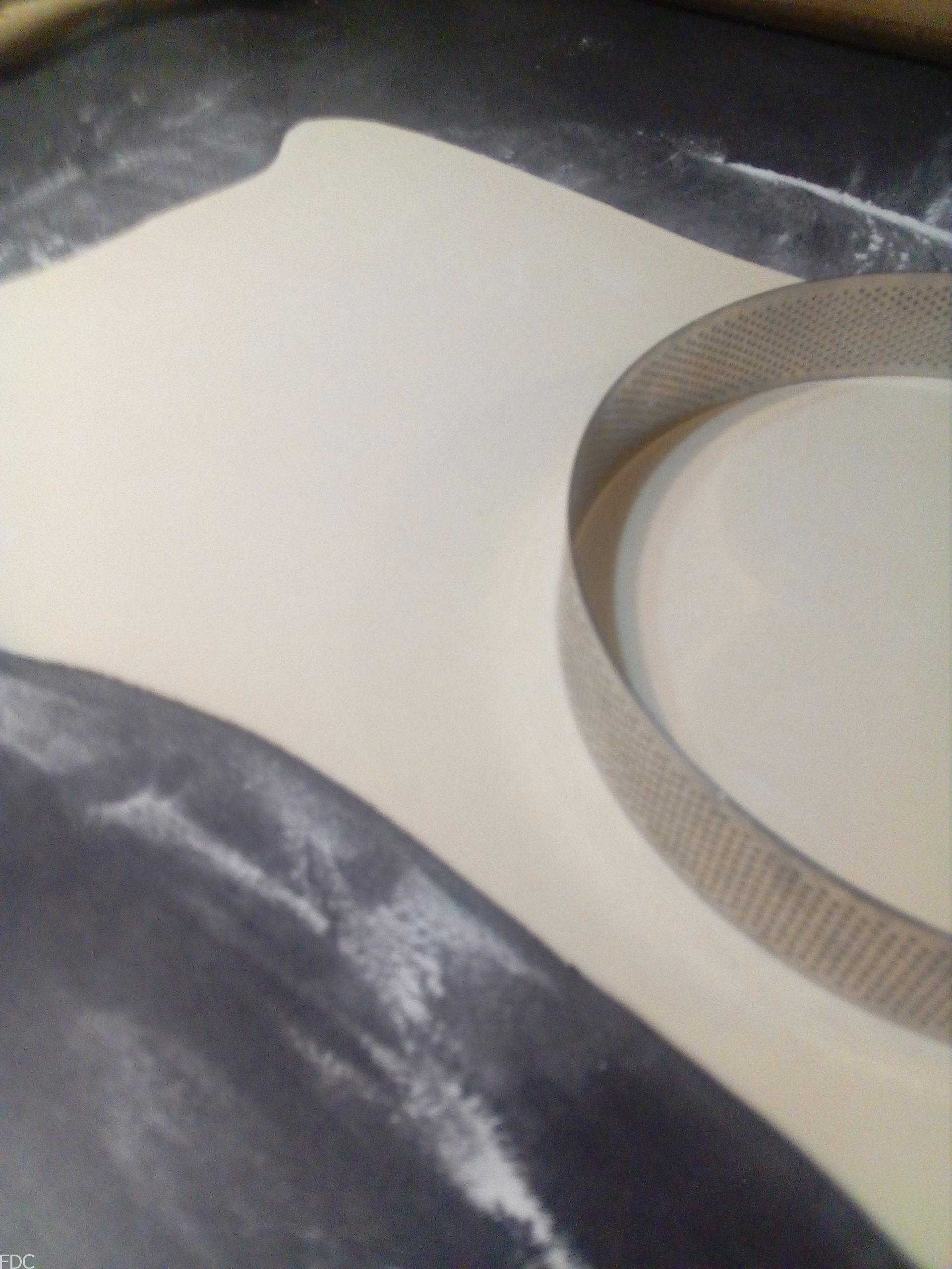 Etaler le feuilletage 3 à 5 mm et découper deux cercles et les mettre sur une feuille de cuisson.