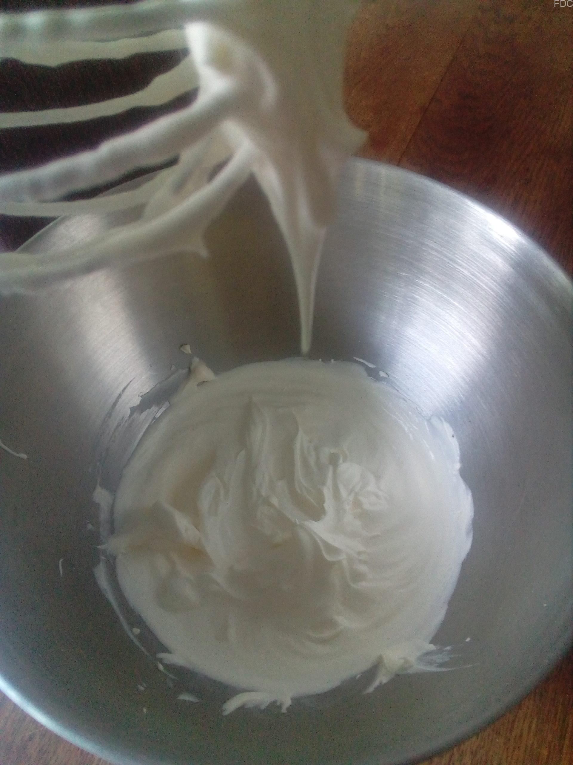 Montez la crème fouettée avec votre robot ou à la main (pour les gros bras !). Pour réussir votre crème, il est conseillé de la sortir au dernier moment pour qu’elle soit bien froide. J’ai une préférence pour la crème épaisse (je suis de la vieille école) pour ce genre de mousse car elle aura une meilleure tenue. Cependant j’ajoute 4 cl de lait ou d’eau (si pas de lait entamé), pour détendre un peu la crème.