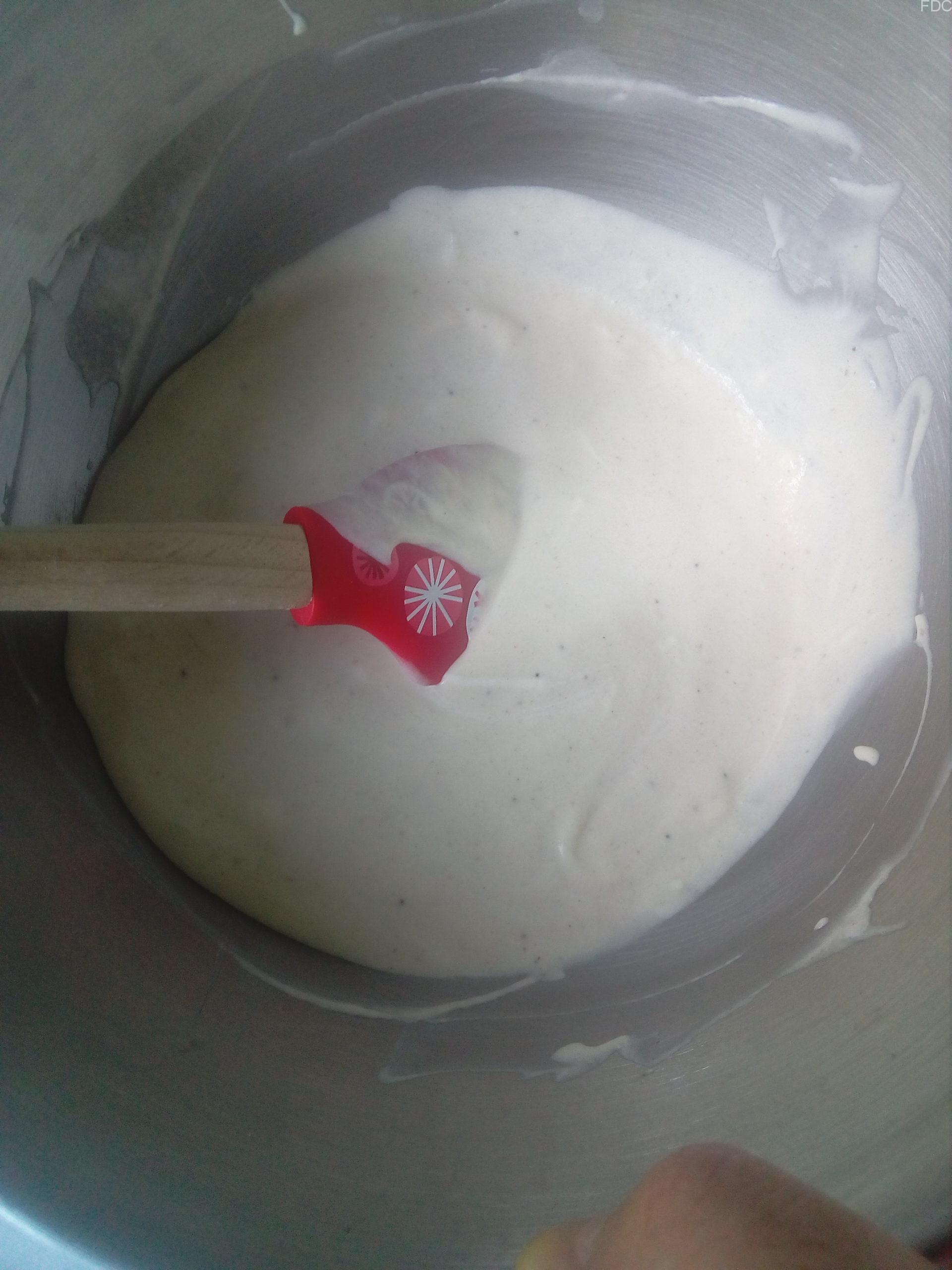 Un quart pour détendre la crème de banane et ensuite le reste délicatement en aérant votre appareil pour ne pas casser la mousse.