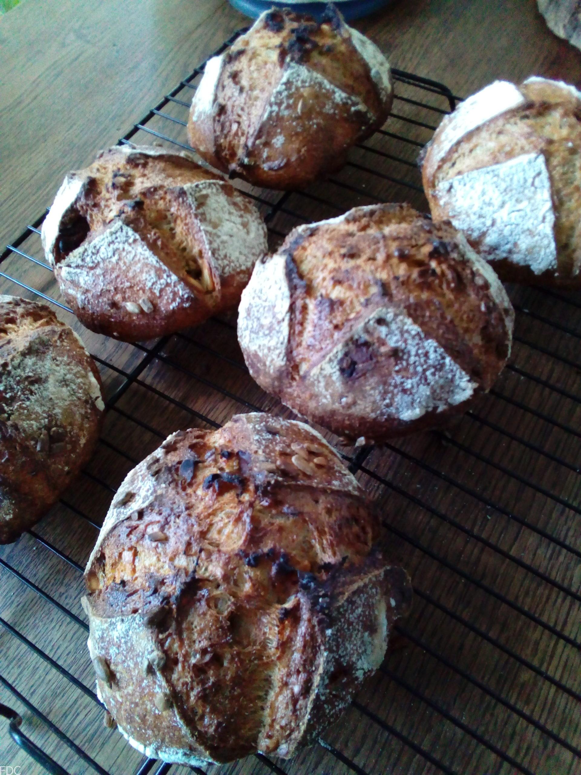 Sortez les petits pains du froid juste au moment d’enfourner. Retournez-les sur une pelle à pizza farinée, mettez un peu de farine, des graines de tournesol et grignez comme vous le souhaitez. Enfournez immédiatement et rapidement, ajoutez un verre d’eau. Attention à l’ouverture qui peut dégager de la vapeur.