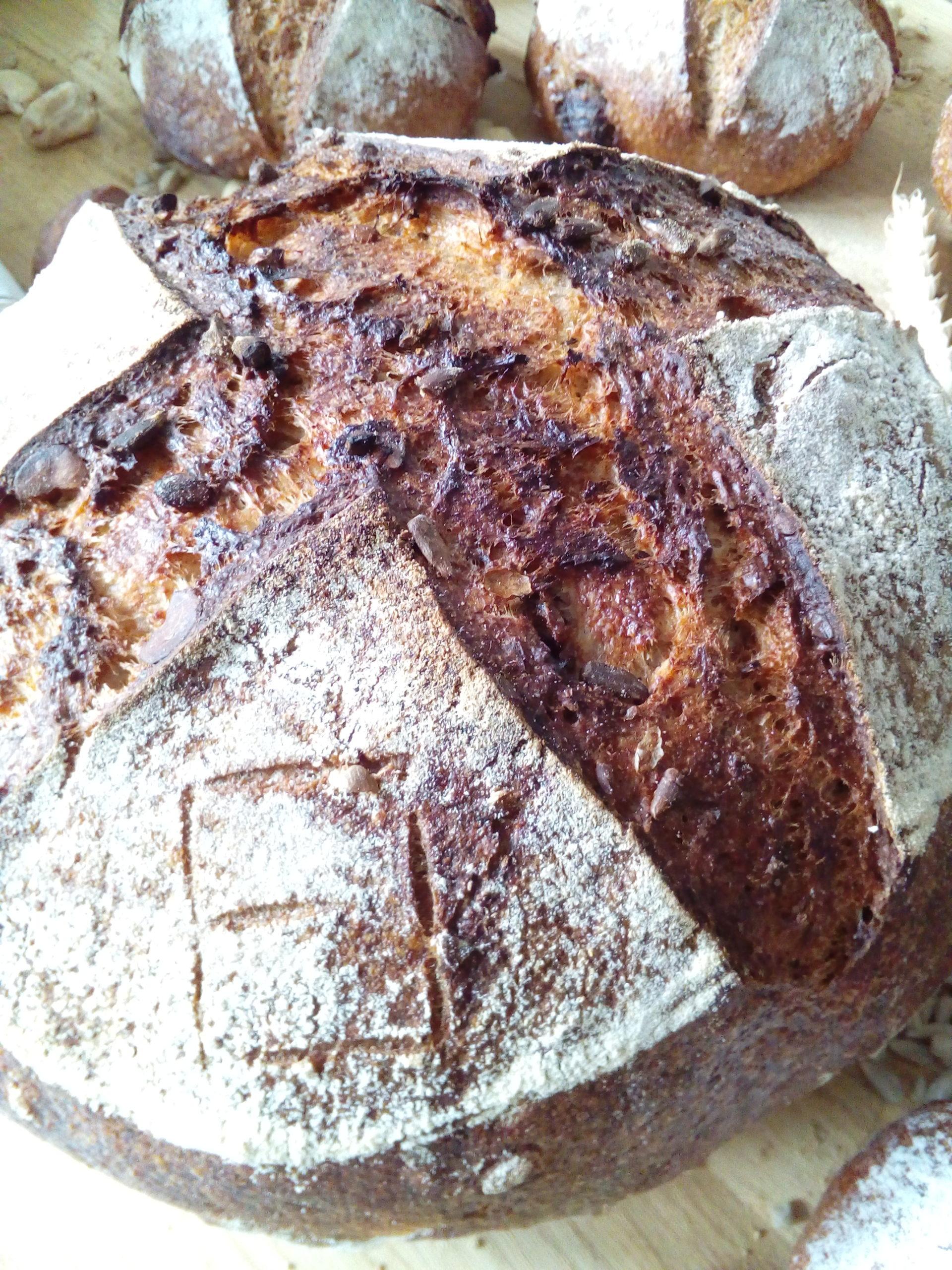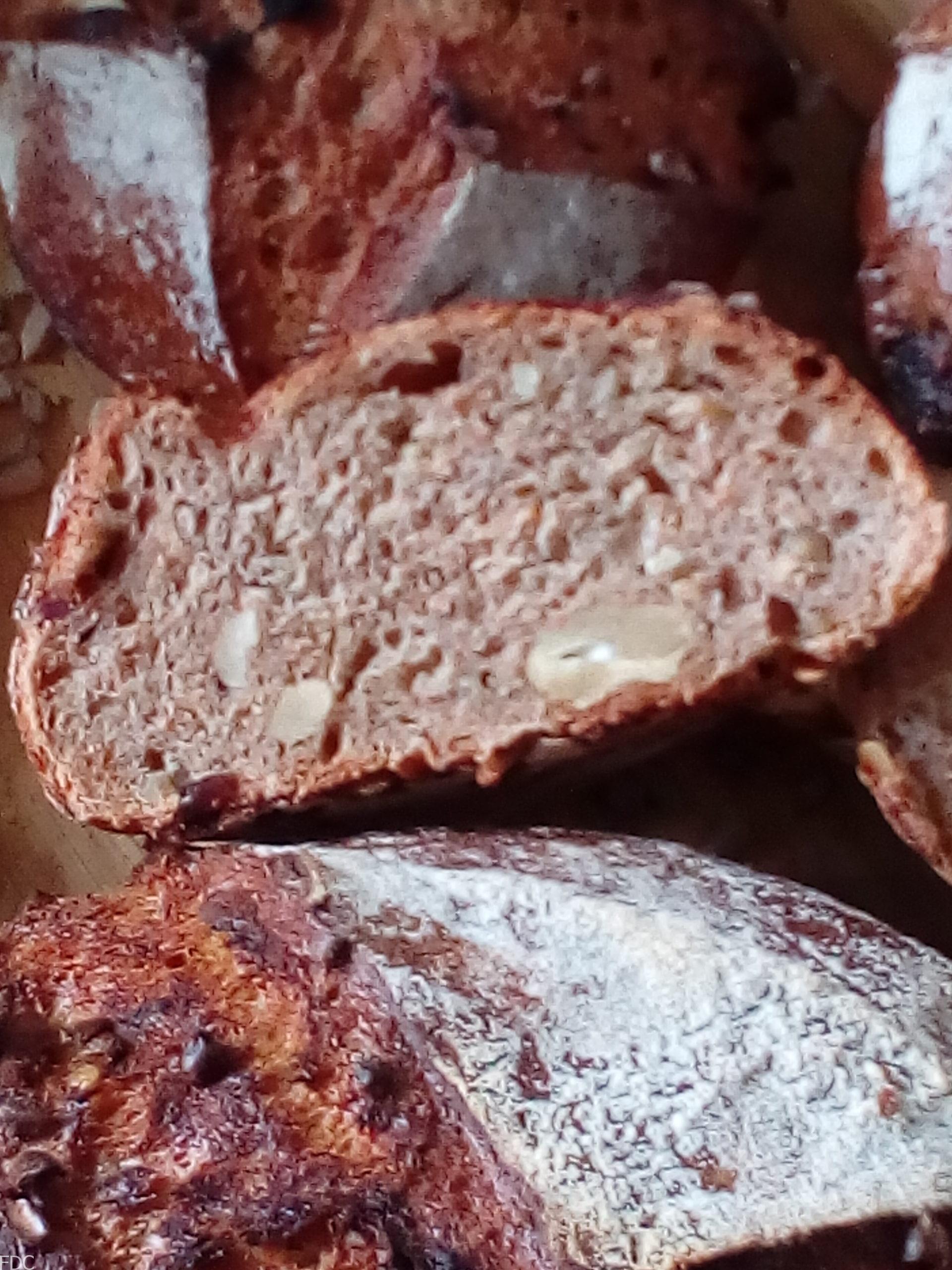 Ce pain intégral et fruits secs est un pain riche et conseillé pour le petit déjeuner, nature en encas ou également sur du fromage de brebis ou fois gras.