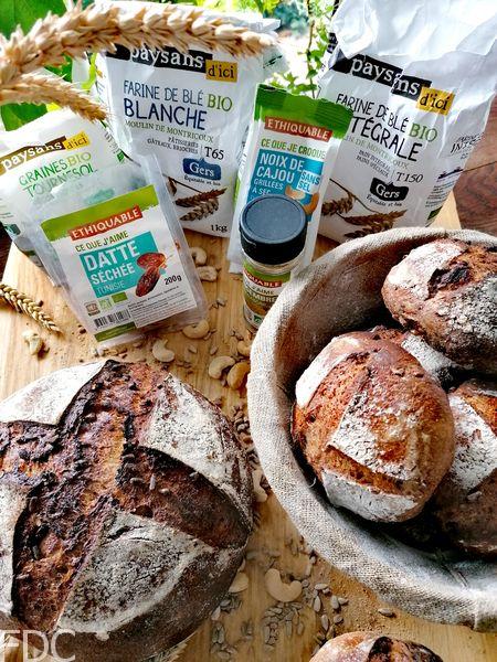 Il a énormément d’atouts, avec un levain naturel de T80 bio, farine Bio intégrale T150 à 70 %, Farine Bio T65 à 30 %. De plus un mélange de fruits séchés (dattes), fruits à coque (noix de cajou), graine (tournesol), le tout mélangé avec de la poudre de gingembre.