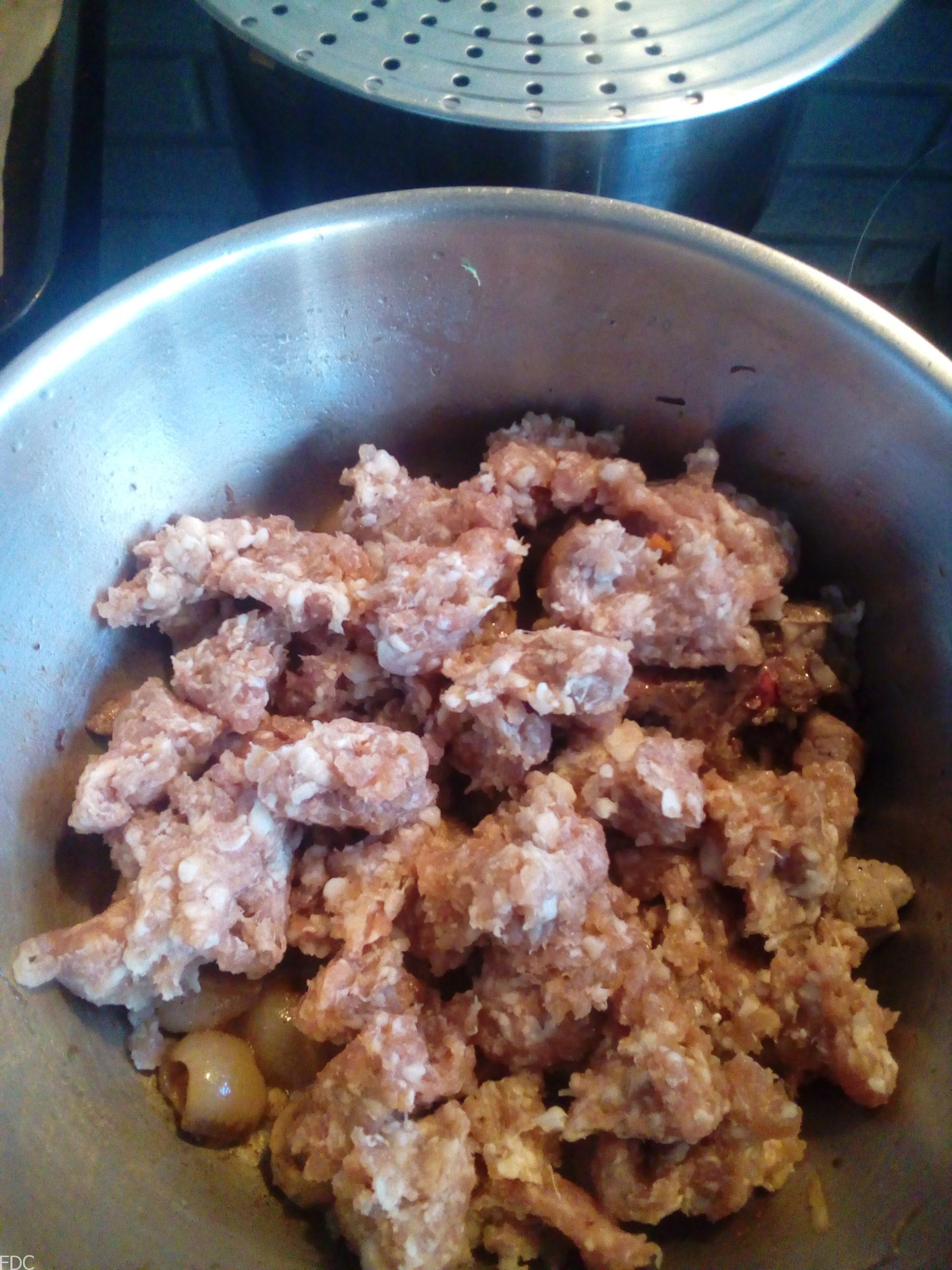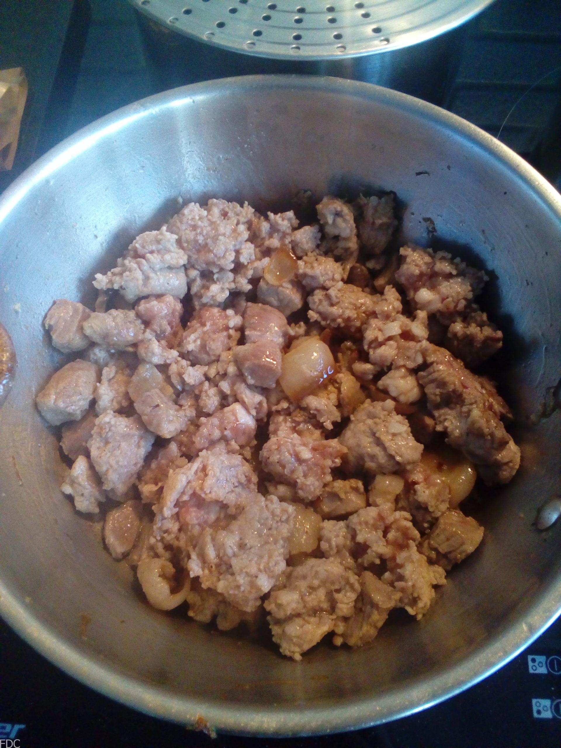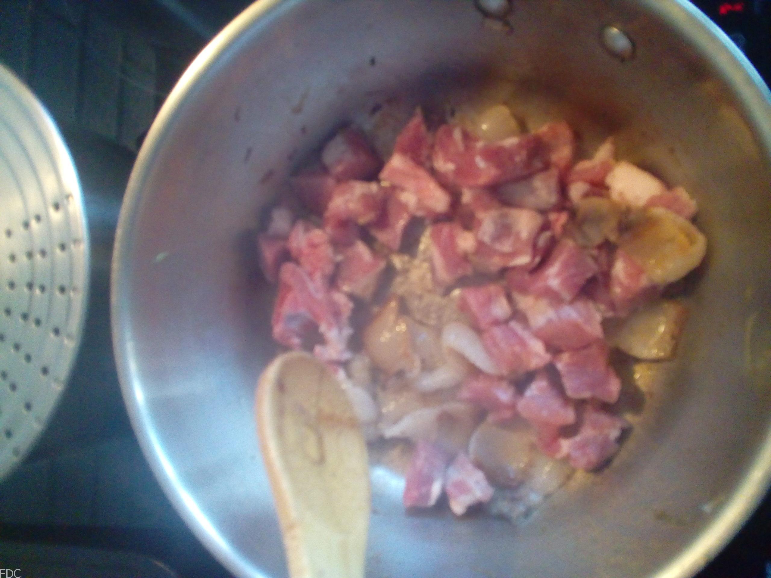 Ajoutez l'échine, saisir à coloration , ajoutez la chair à saucisse en gros morceau, Saisir à coloration
