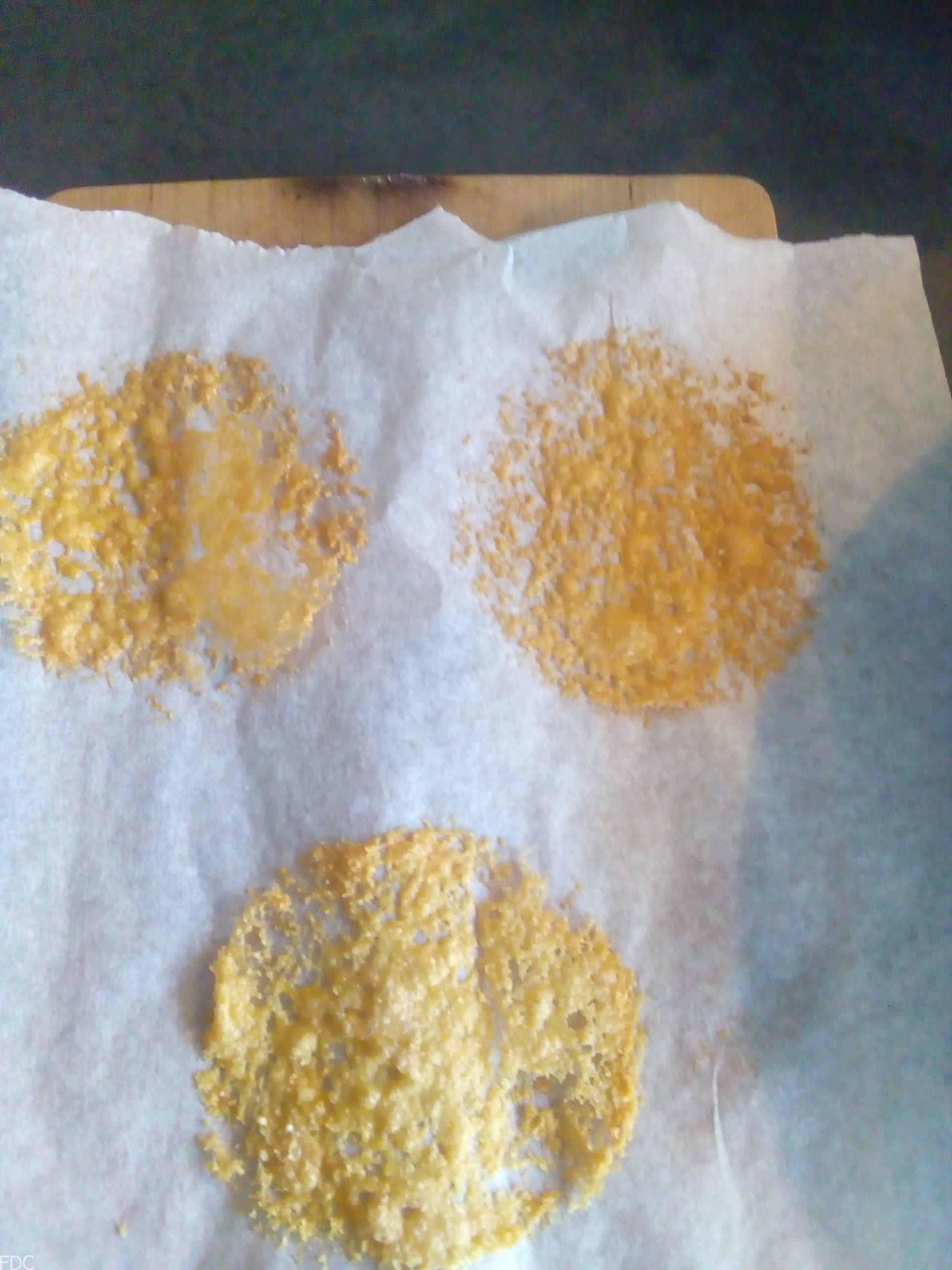 Faites des ronds de parmesan sur une couche mince mais suffisante (avec un cercle à tartelette pour la forme régulière).
