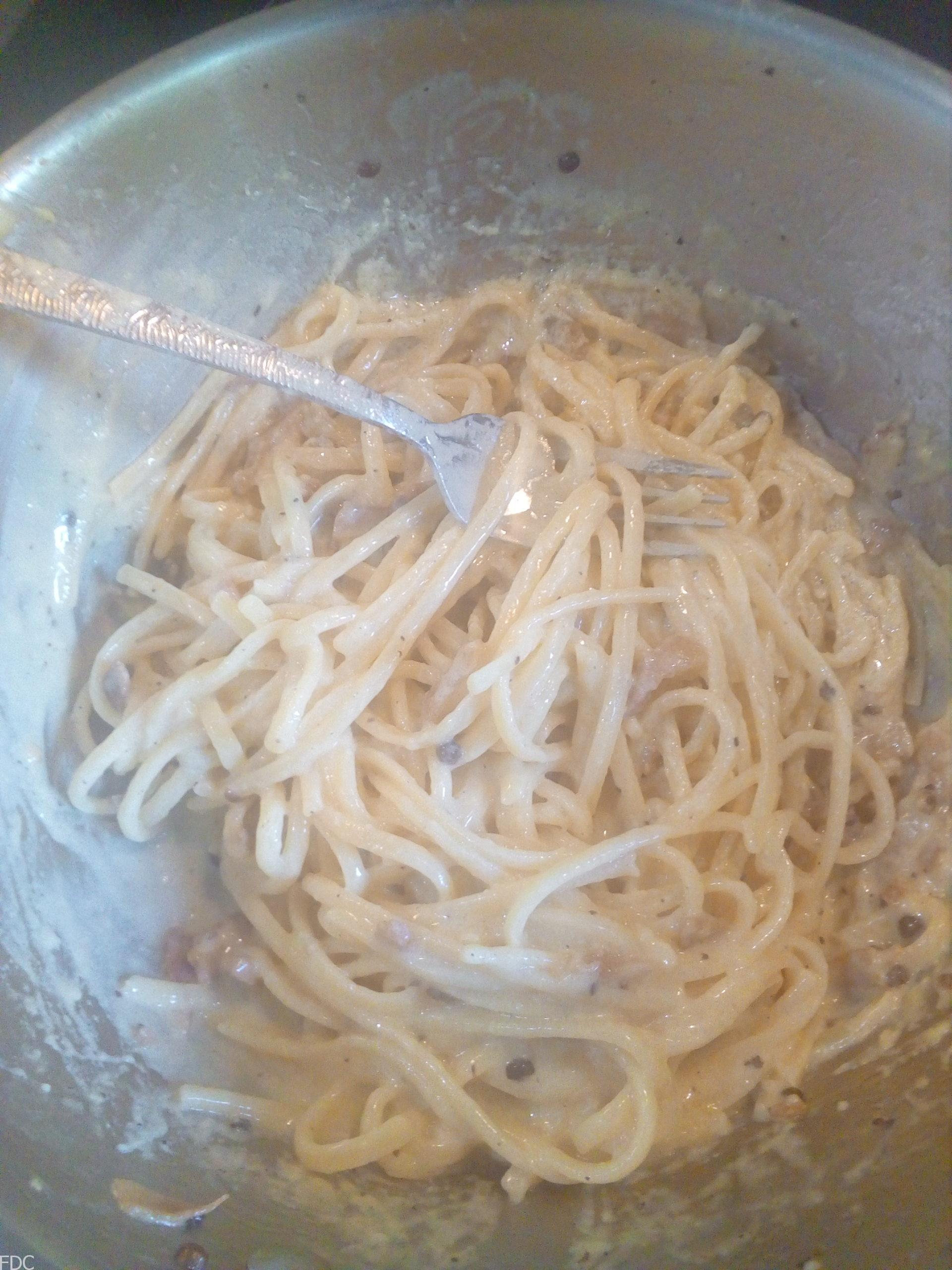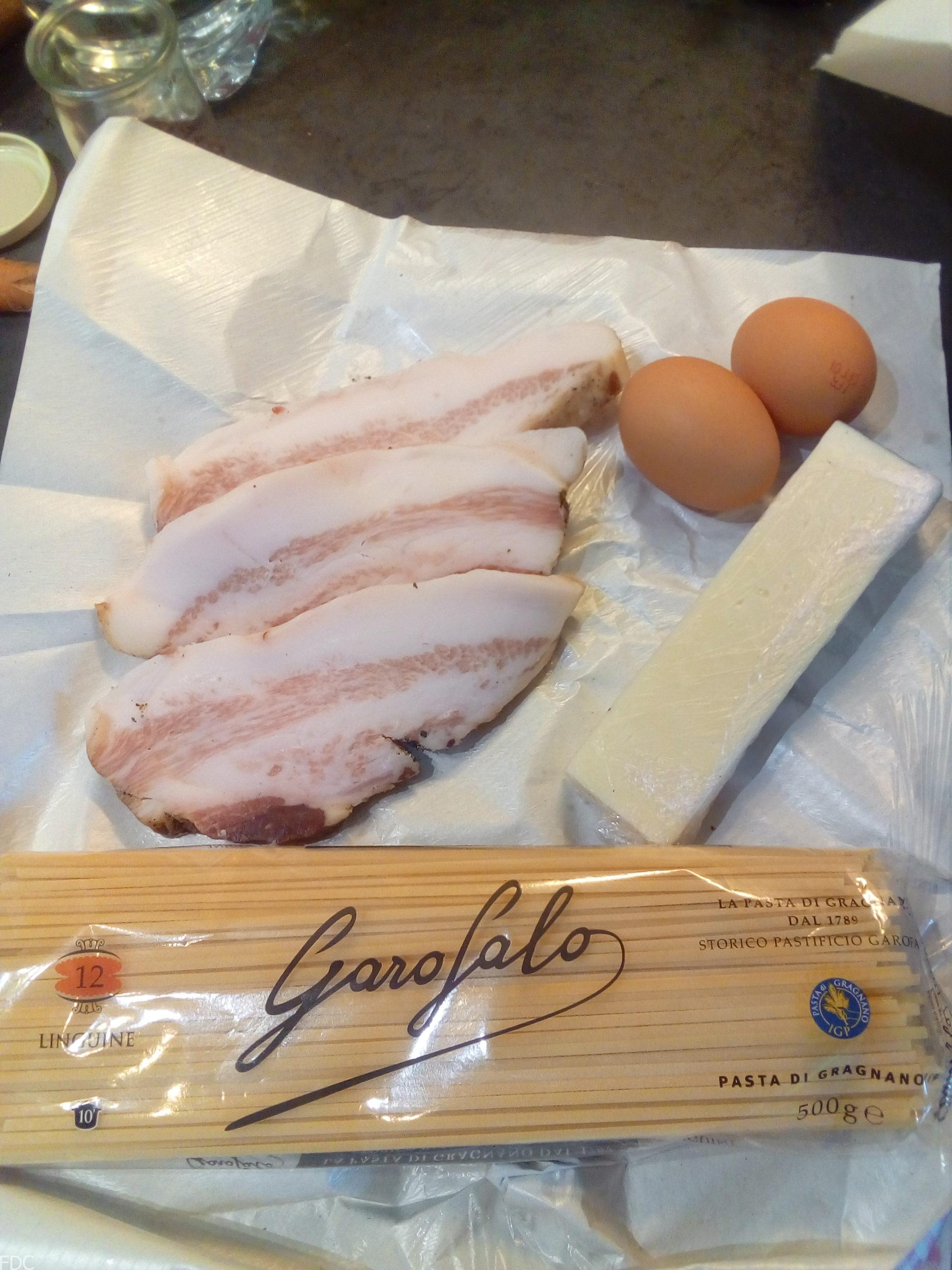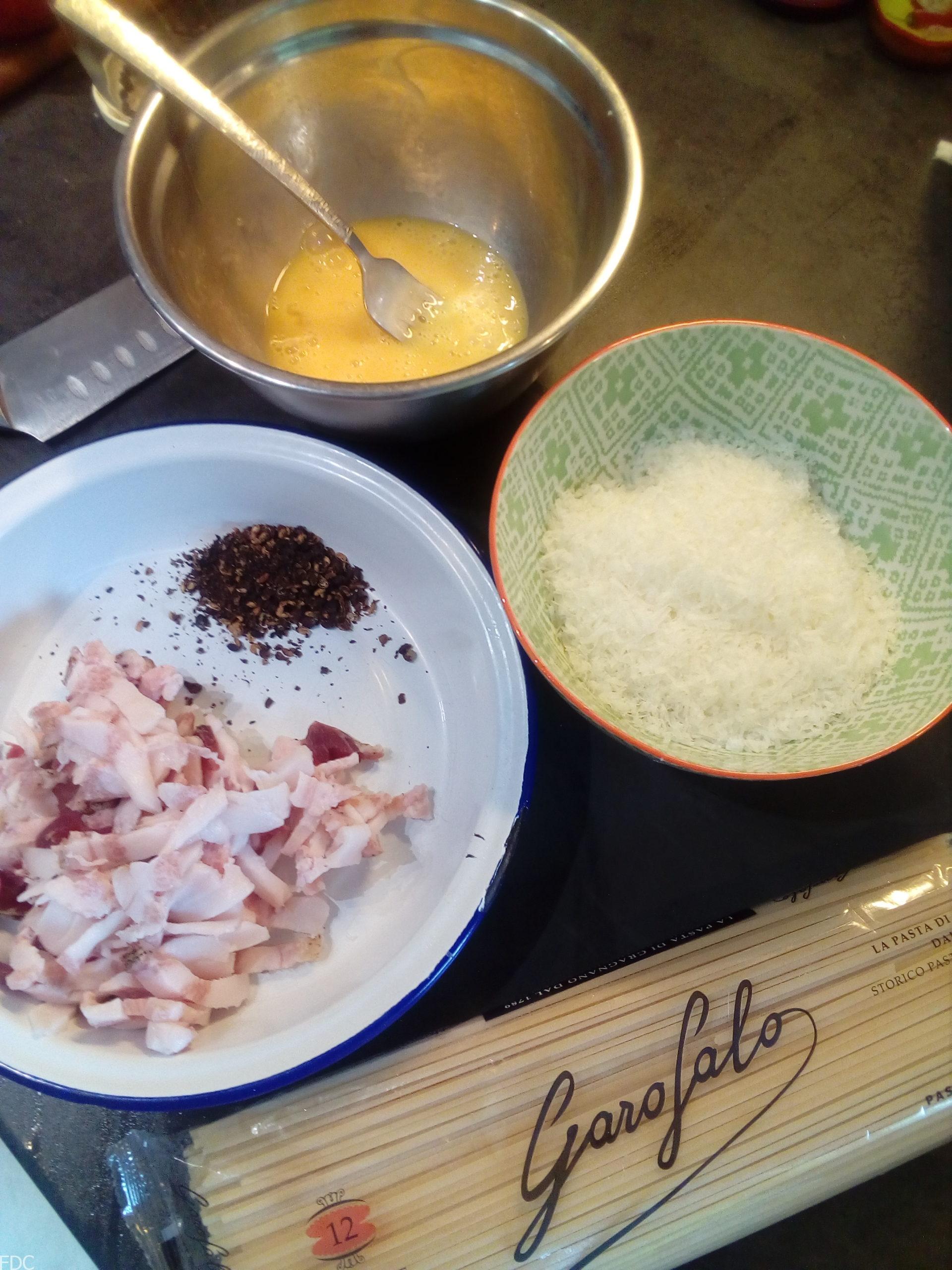 C’est une recette où les ingrédients sont authentiques (Guanciale, pecorino)et seulement ces ingrédients et rien d’autre (hors poivre). Pas crème fraîche, par de lard fumé, pas de Parmesan.