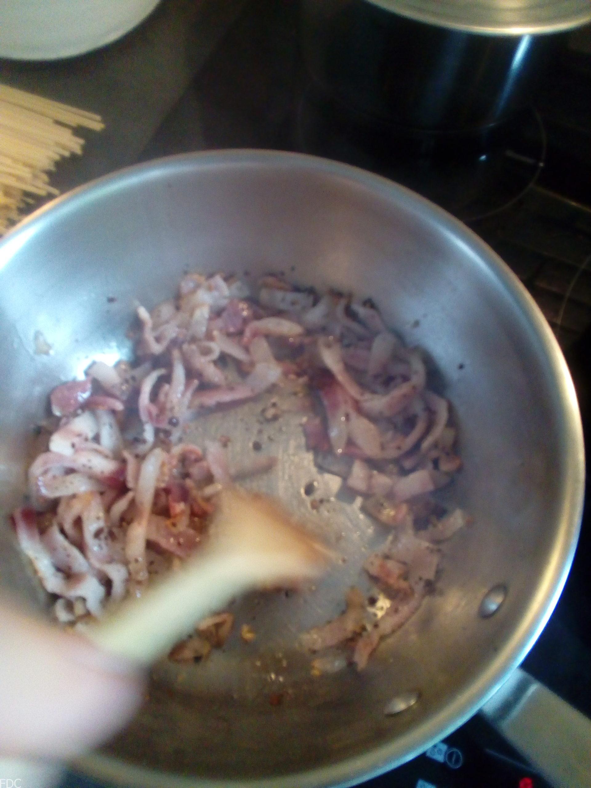Mettez ces deux ingrédients dans une sauteuse à cuire, le poivre va torréfier et le Guanciale va rendre son gras. Lorsque qu’il est bien cuit, débarrassez la moitié du lard sur une assiette et papier absorbant.