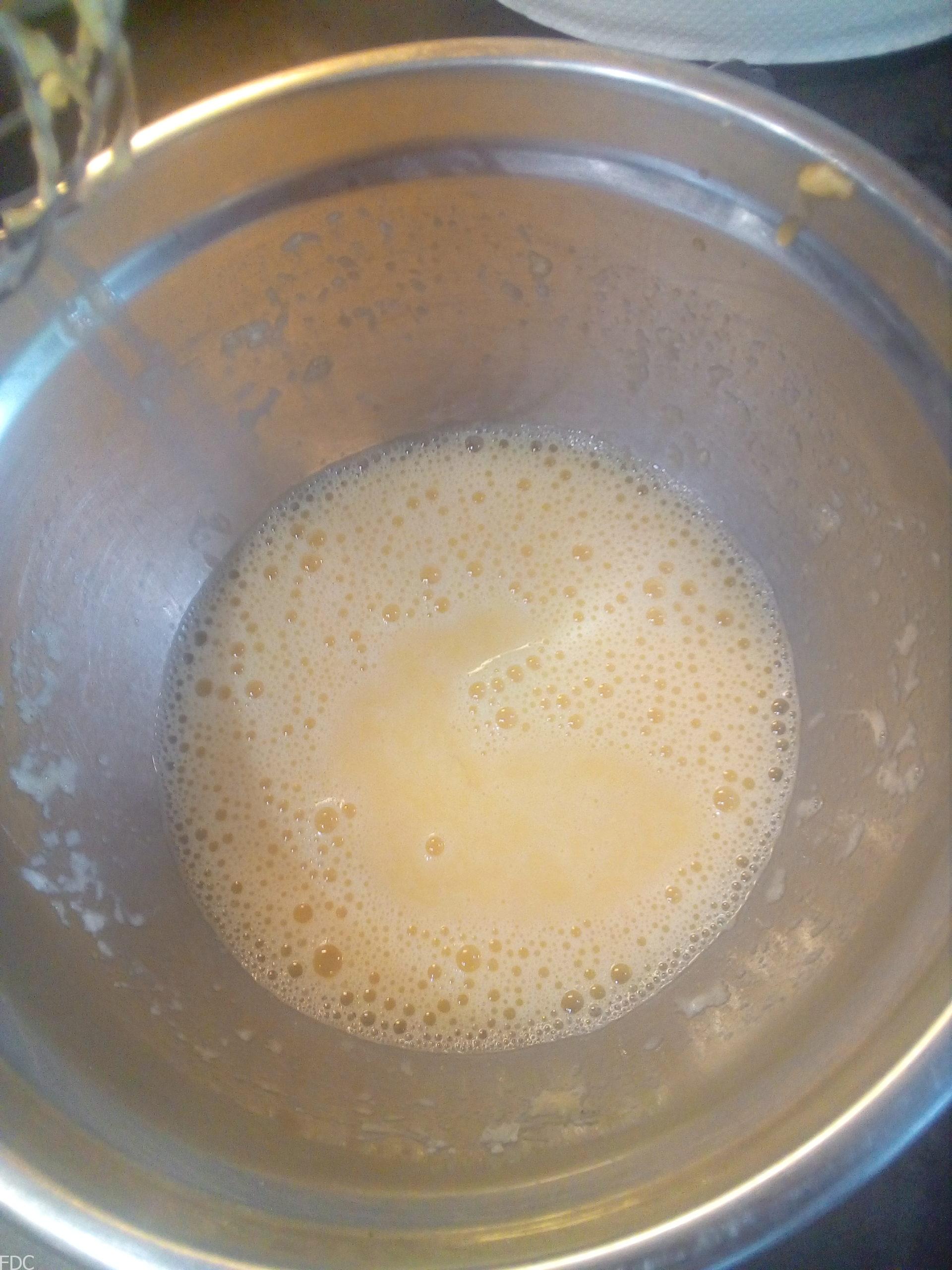 Prenez votre saladier (œufs plus Pecorino), ajoutez 5 cl d’eau de cuisson bien chaude et fouettez vigoureusement (aspect crémeux blanchissant).