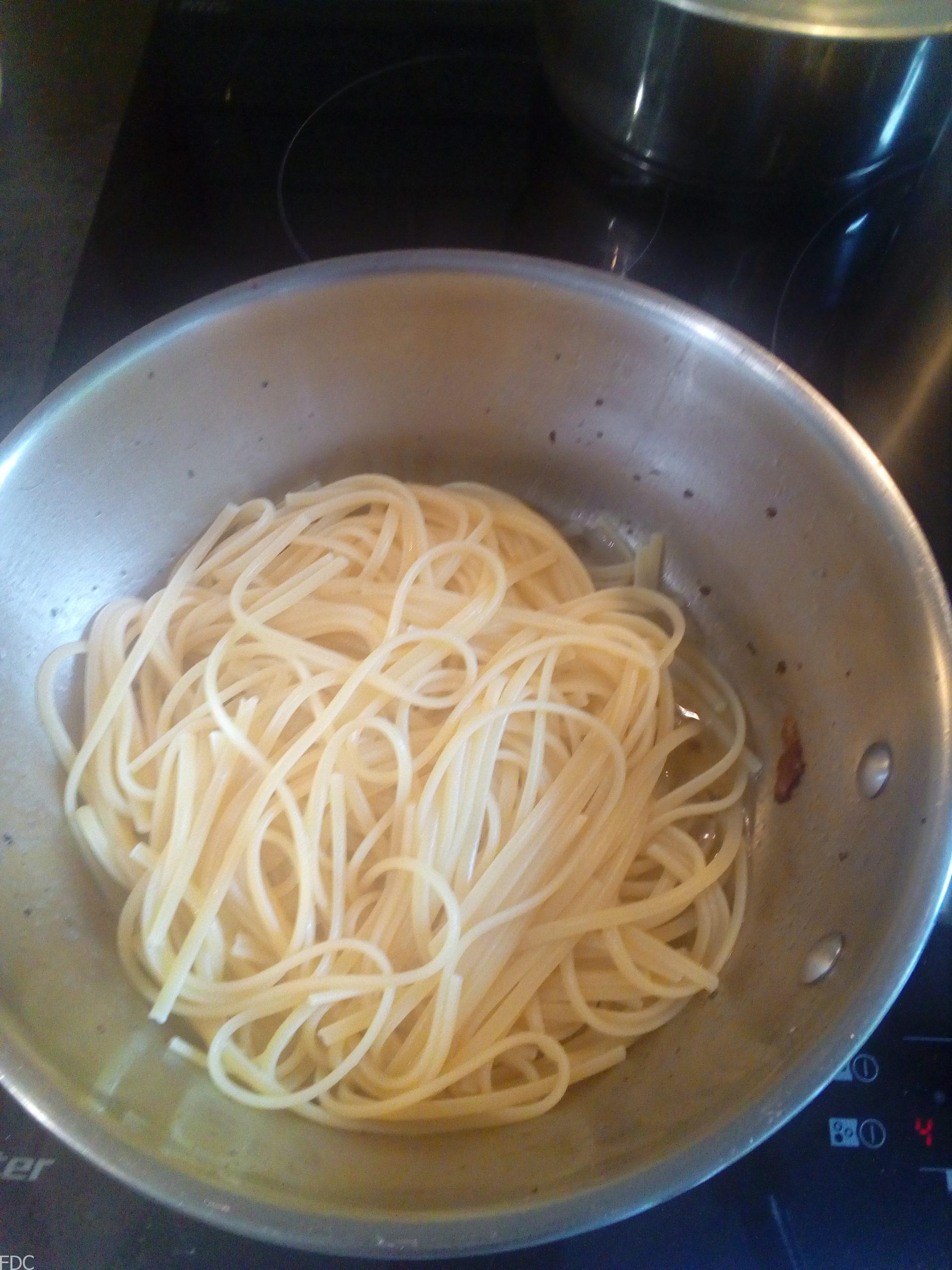 Quand vos pâtes commencent à être translucide et un peu se ramollir (7 minutes environ), transversez-les dans la sauteuse avec une pince et ajoutez un peu d’eau de cuisson pour finir la cuisson par absorption tout en gardant un peu de liquide crémeux.