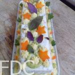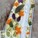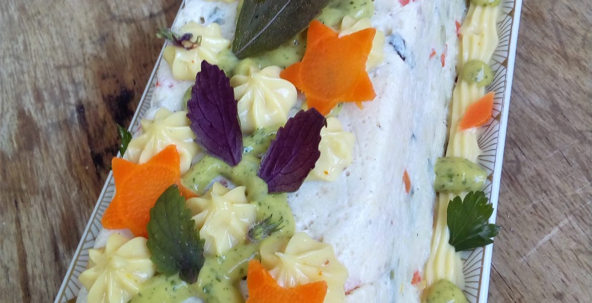Saumon fumé : mettre le saumon fumé avec 25 g de beurre et une belle cuillère de crème, poivre et citron. Ne salez pas le saumon est déjà salé. Mixez et rectifiez l’assaisonnement si nécessaire. Pour l’utiliser en insert lors du moulage, je forme un boudin avec du film alimentaire. Réservez au frais.