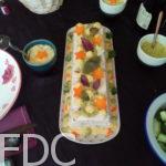 Rascasse : 6 cl de crème fraîche, 50 g de beurre, Un demi jus de citron plus un zeste, assaisonnement, herbe. Mixer grossièrement pour conserver de la mache. Débarrasser et ajouter une partie de la brunoise. Rectifier l’assaisonnement à votre goût. Réservez au frais.