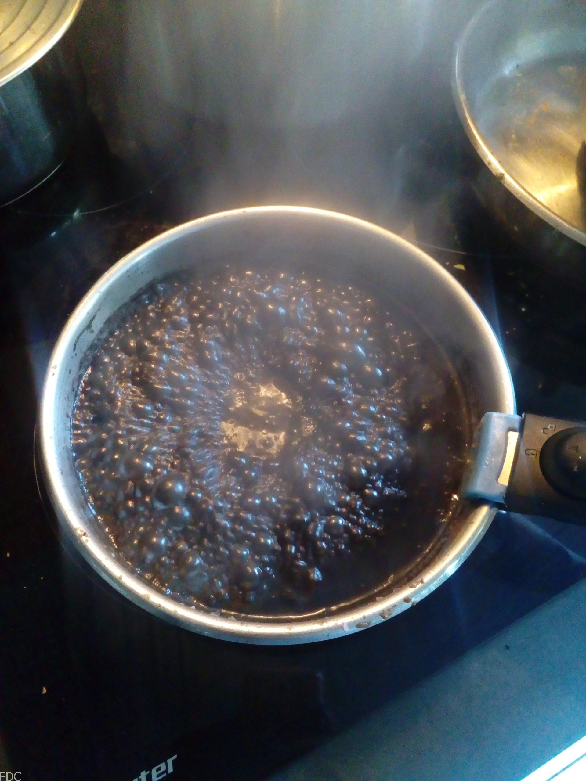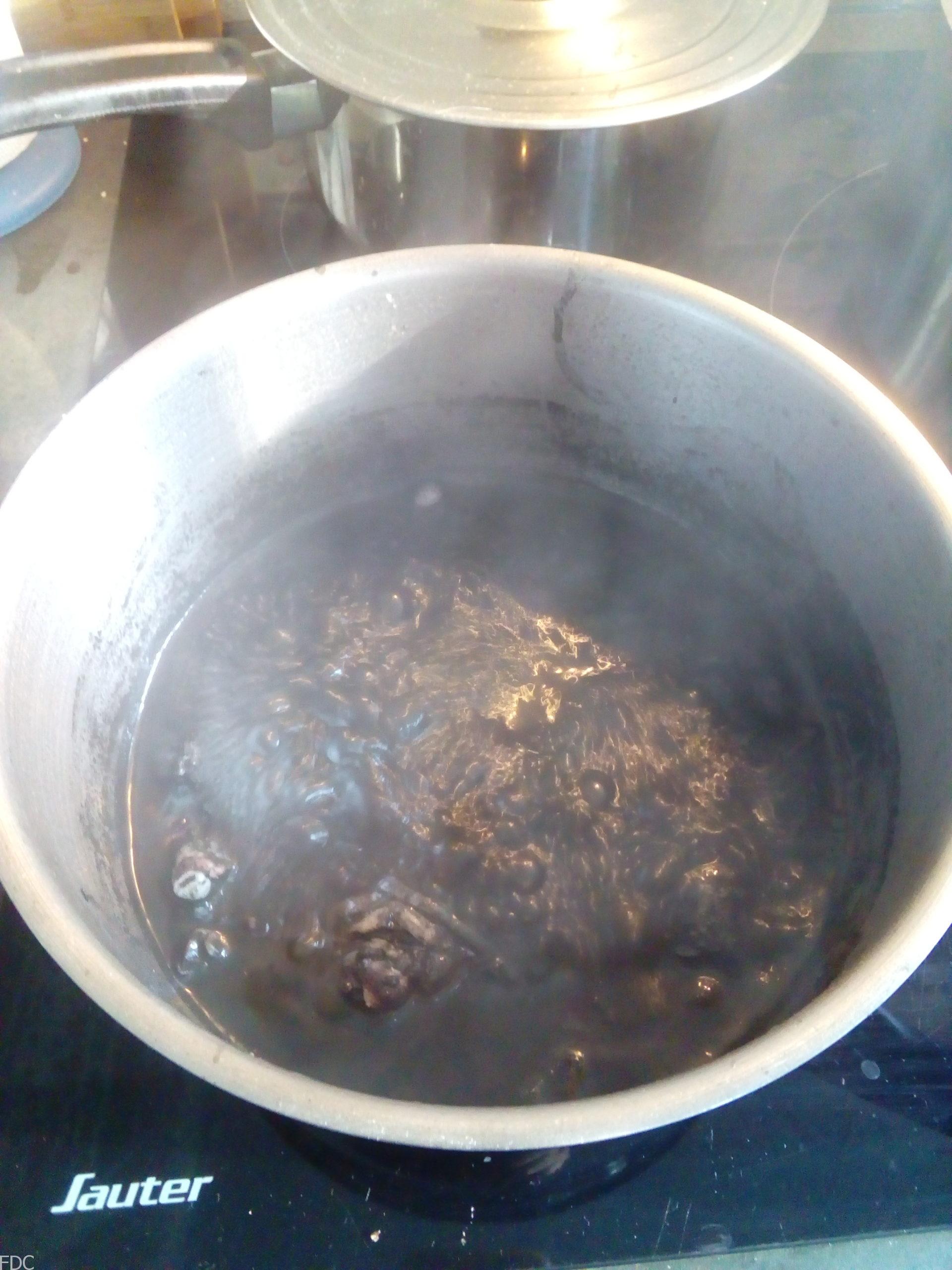 Pour le fumet, faite suer la garniture de légume, ensuite ajouter les restes de seiche. Cela risque de noircir de suite signe que vous avez de l’encre. Mouillez avec 50 cl d’eau et laissez cuire 15 minutes.