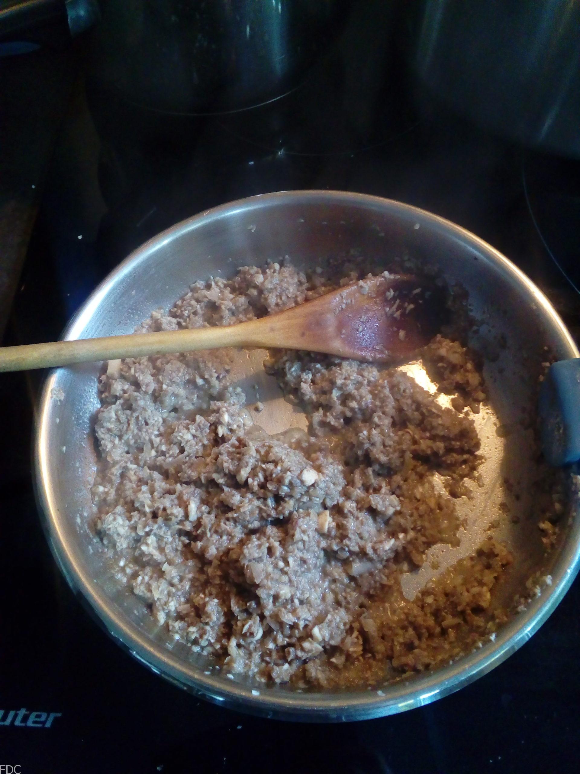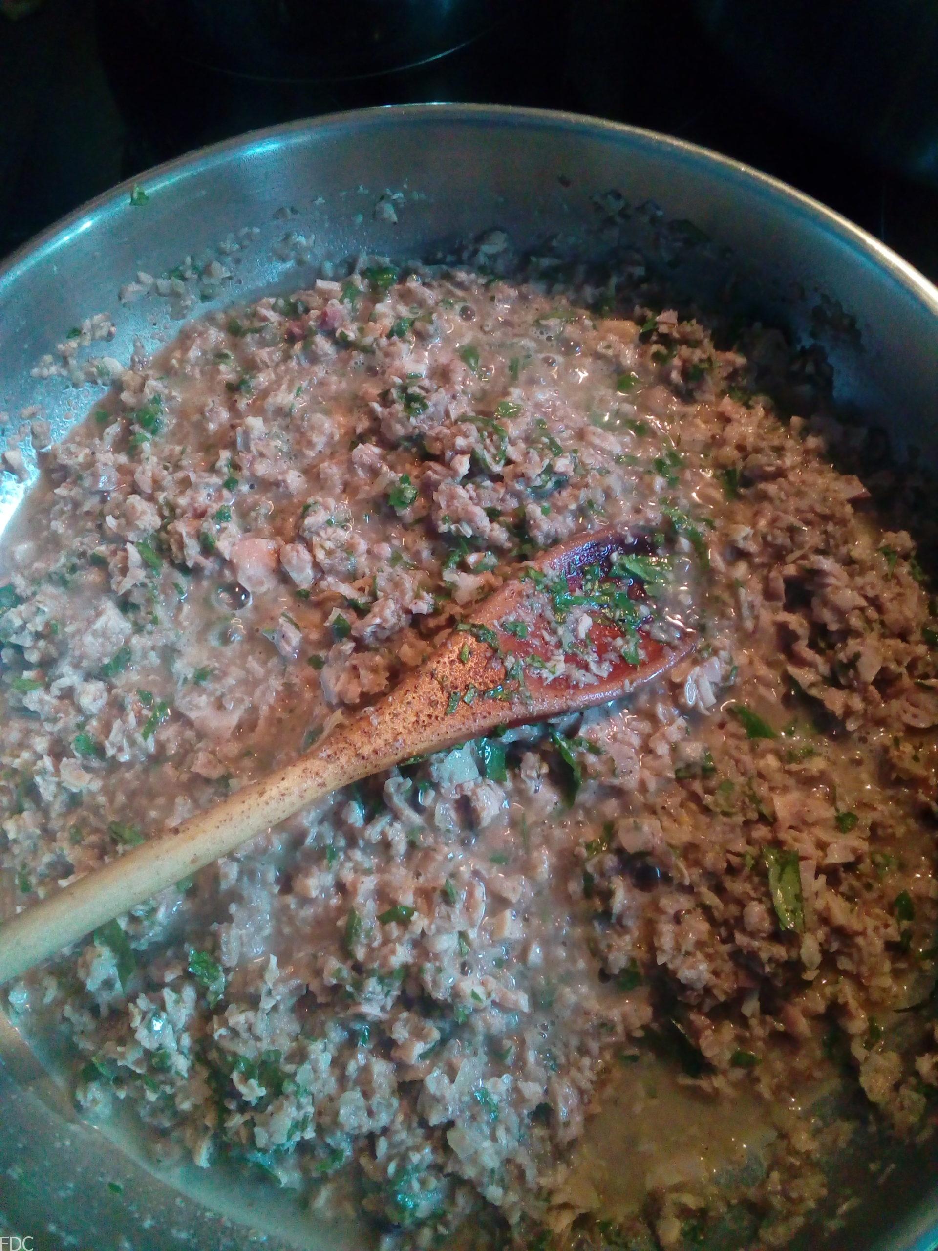 C’est une phase délicate si vos poches sont fermées. Sinon vous emplissez de farce et refermez la poche avec le cure dent au bout du côté tête. Réservez.