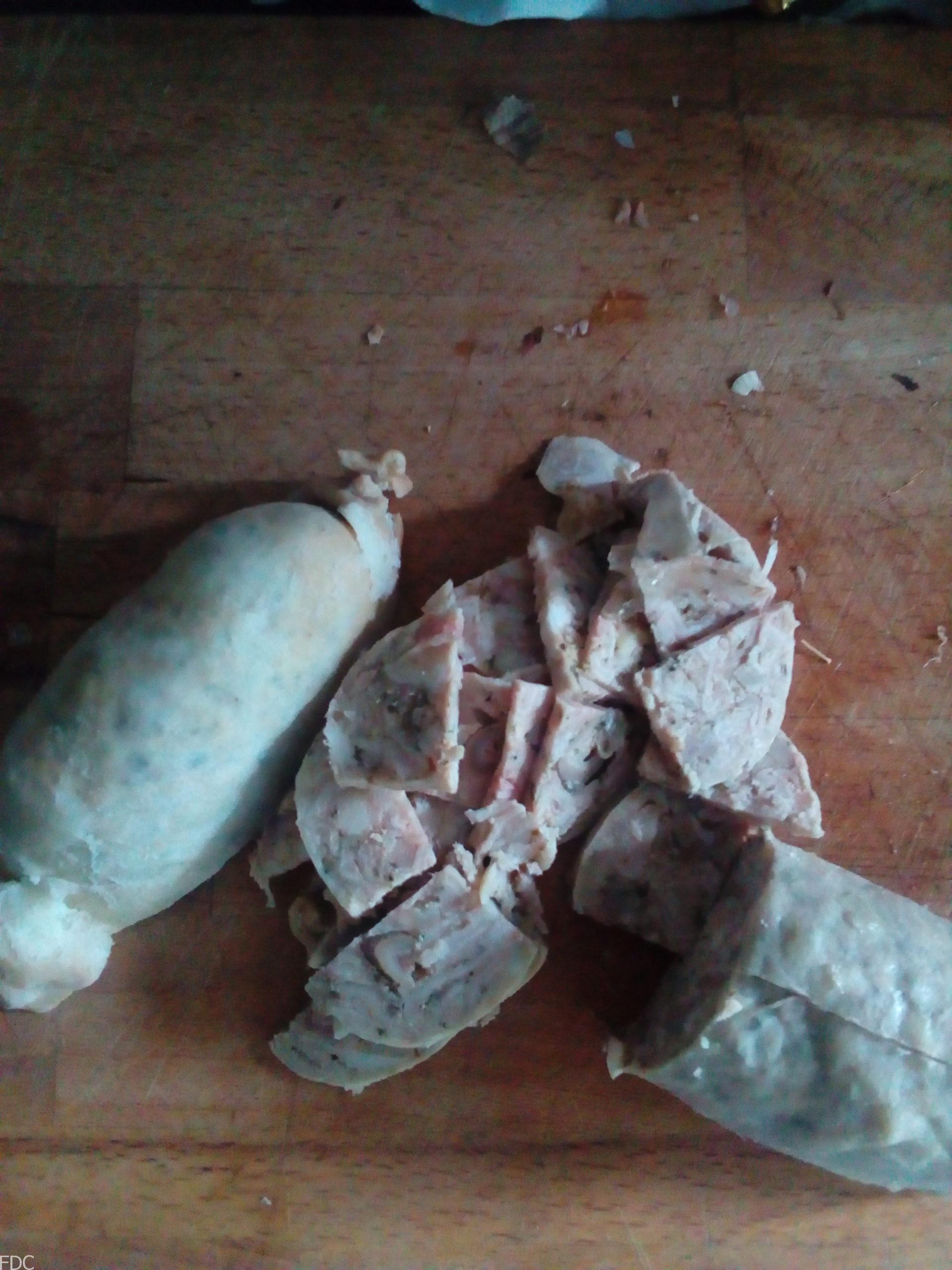 Pendant ce temps, hachez-les au couteau en menu morceaux avec le boyau sauf si vous prenez une andouillette industrielle (ce qui serait dommage).