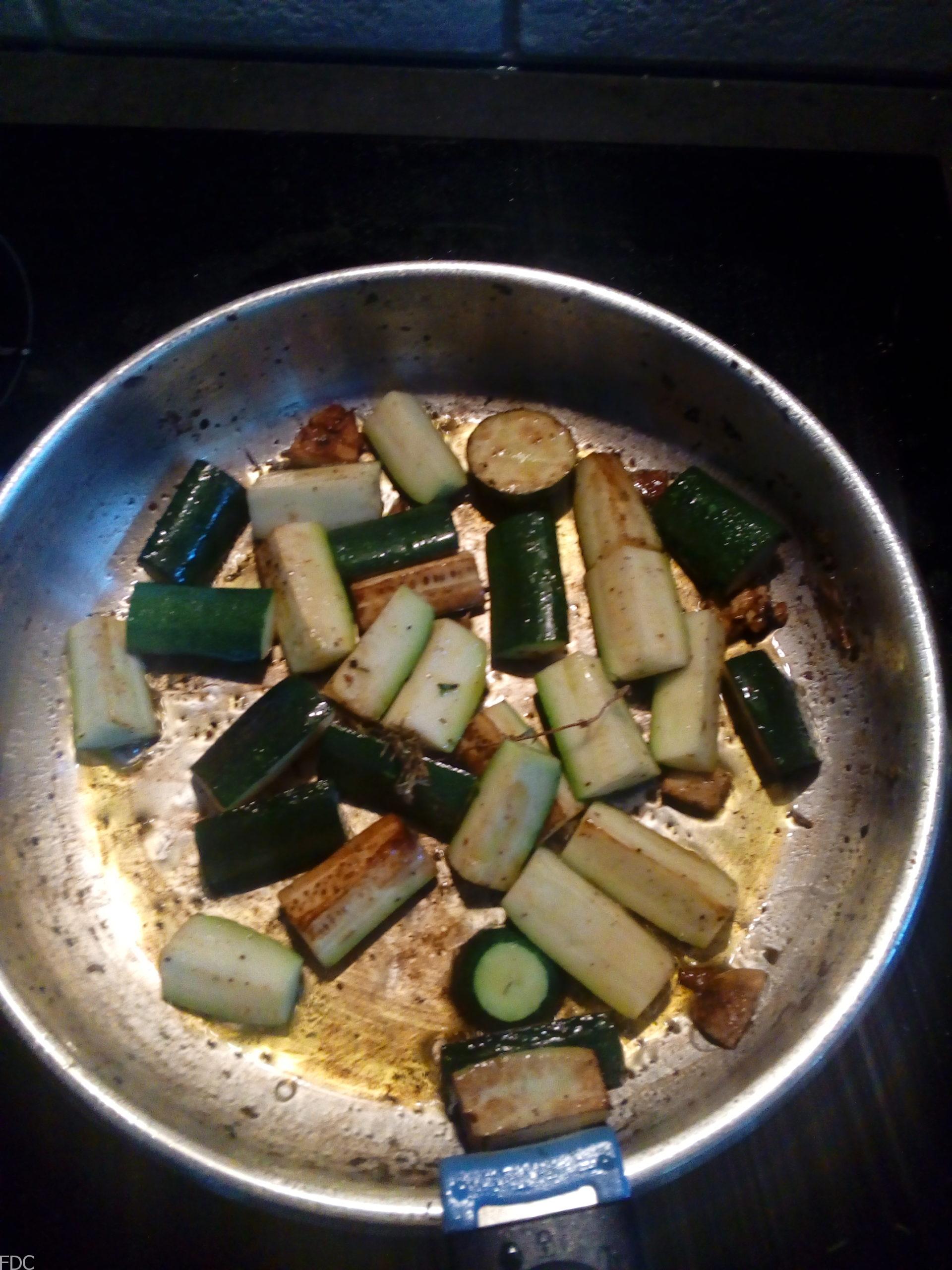 Les courgettes coupez en tronçons réguliers (3 cm environ) et coupez les tronçons en quartier ou en 6 selon le diamètre. Taille régulière de préférence pour une cuisson homogène.