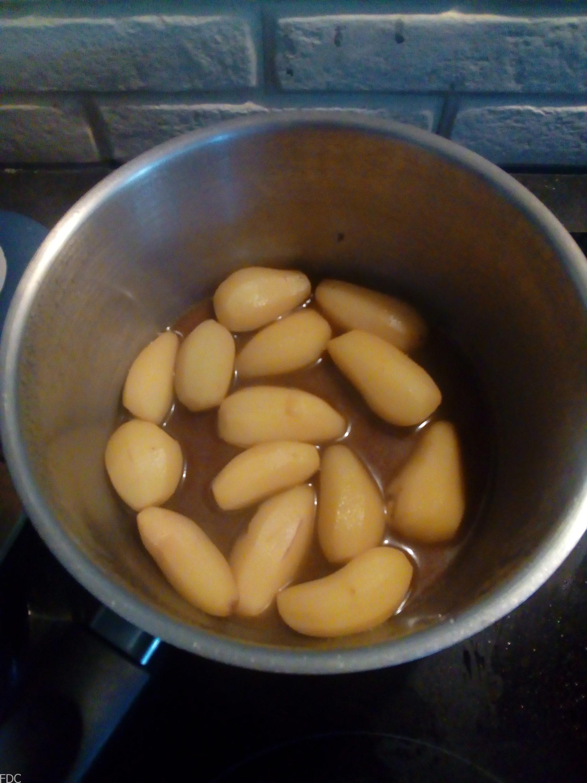 Lavez et épluchez les pommes de terre et cuisez-les à la vapeur ou eau salée. Pour ma part j’ai fait des pommes de terre fondantes en les cuisant dans un bouillon.