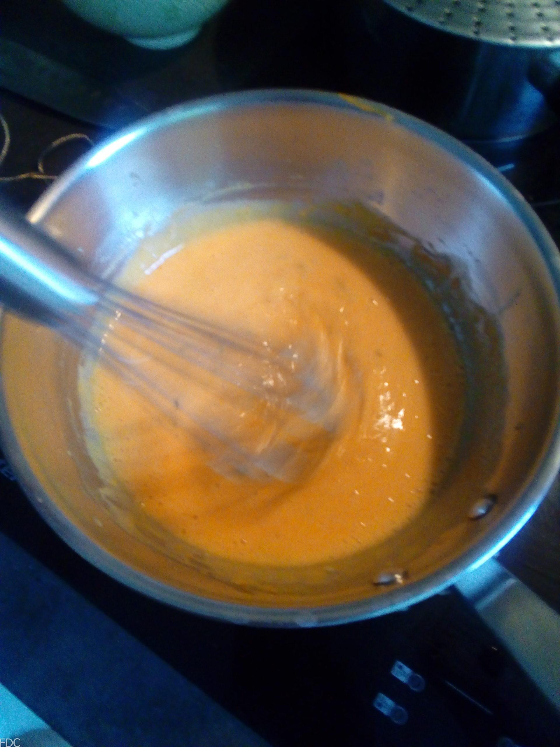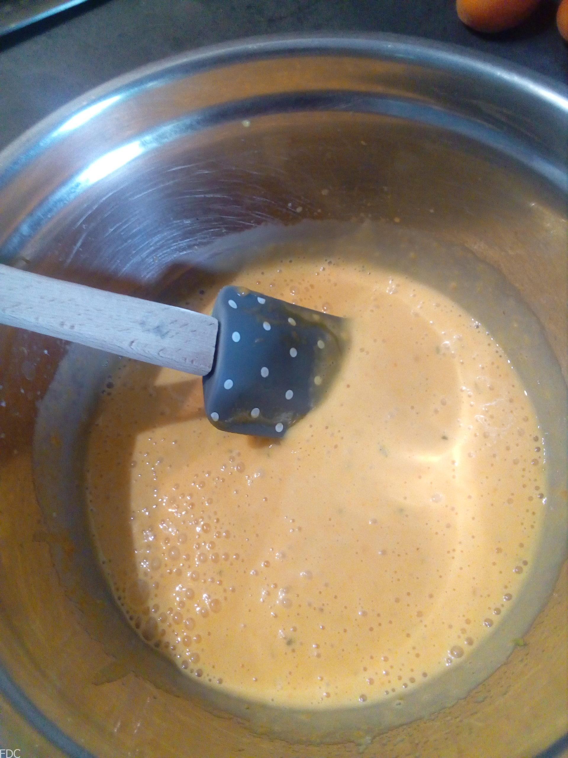 Une fois la compoté très chaude presque ébullition versez le dans votre appareil mélangez bien et remettez dans la casserole pour porter à ébullition sans cuire vos œufs (un peu comme une crème anglaise).