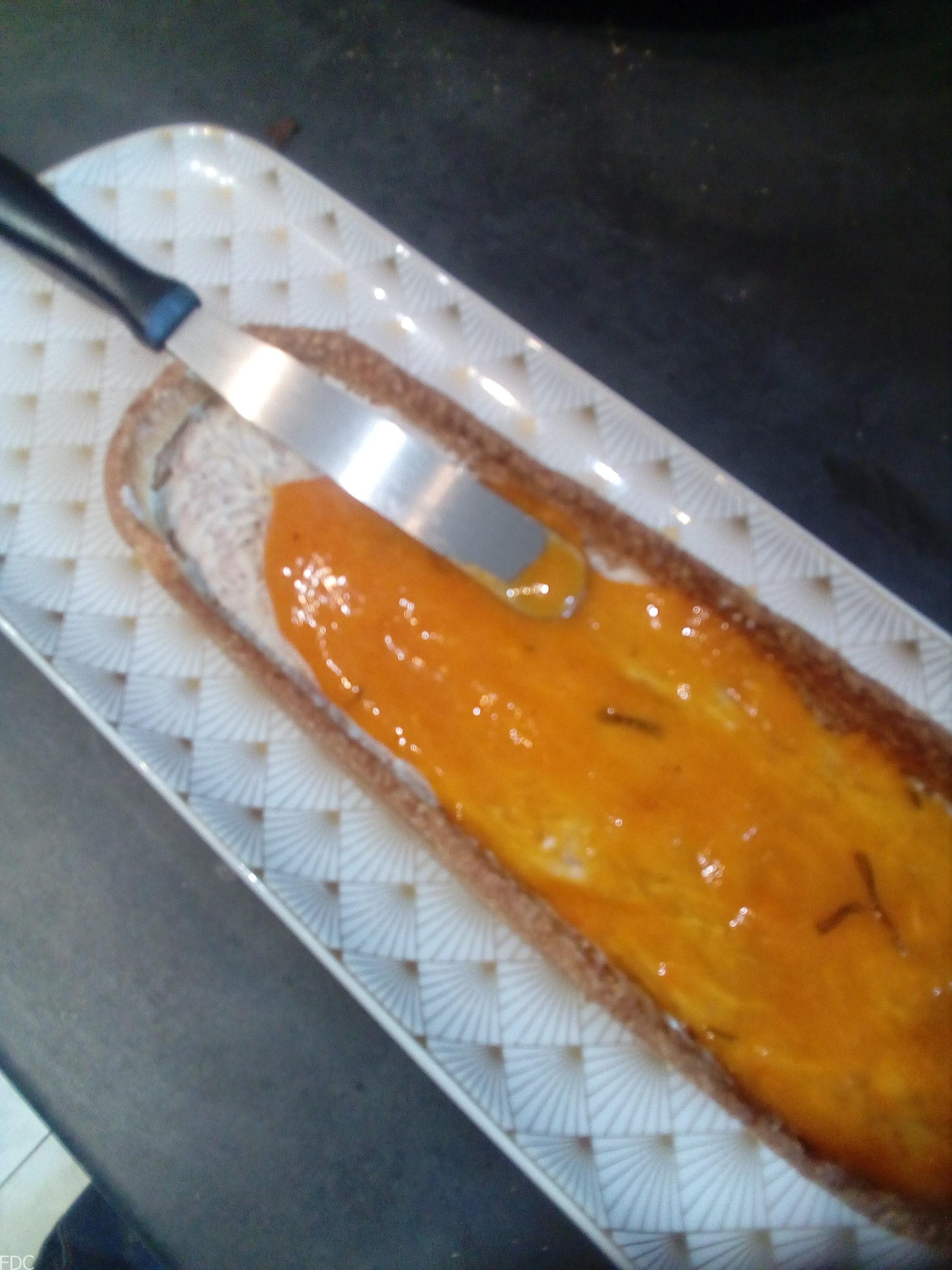 Ajoutez une très fine couche de compotée au fond et ensuite coulez le crémeux à ras bord.