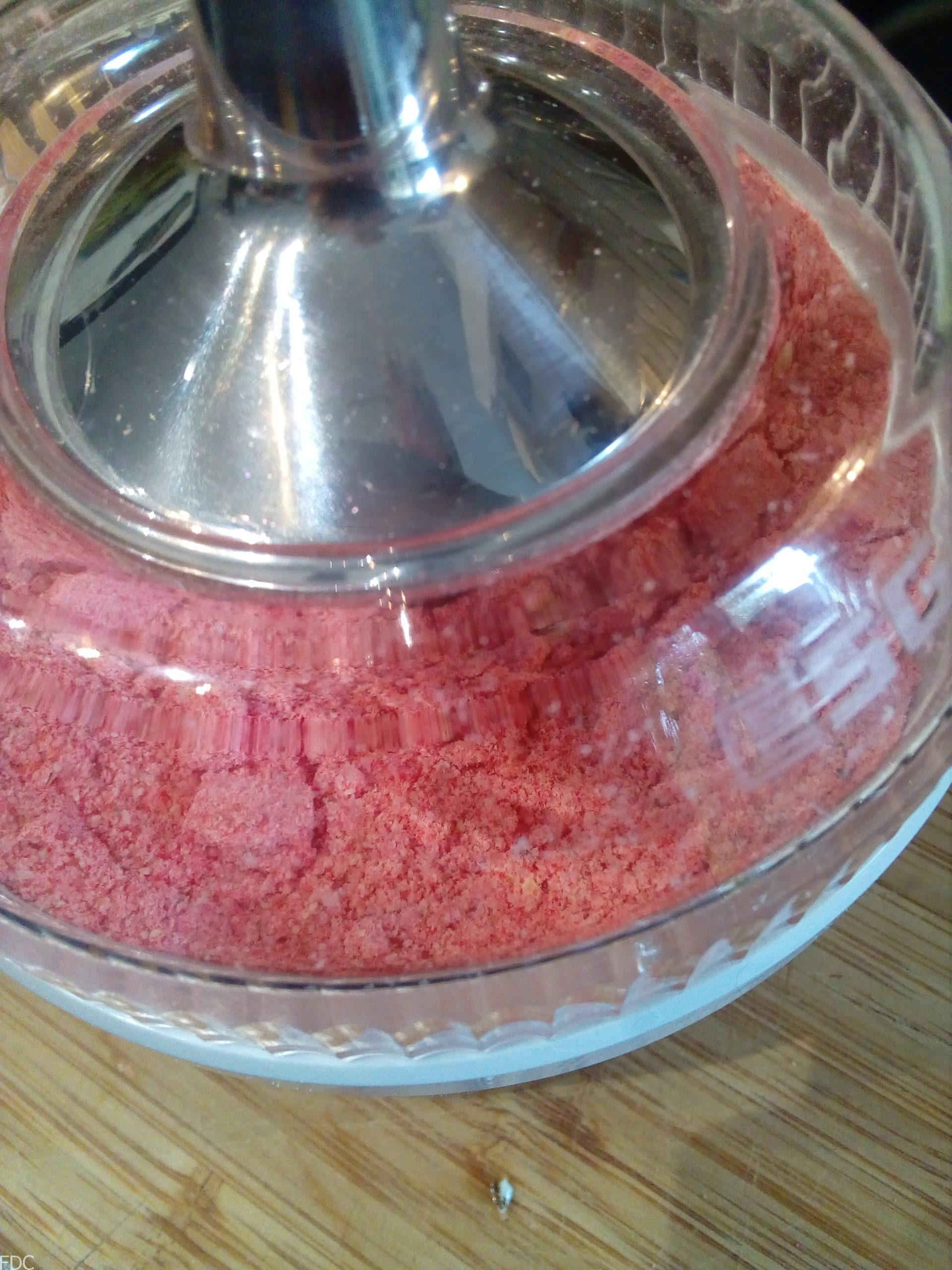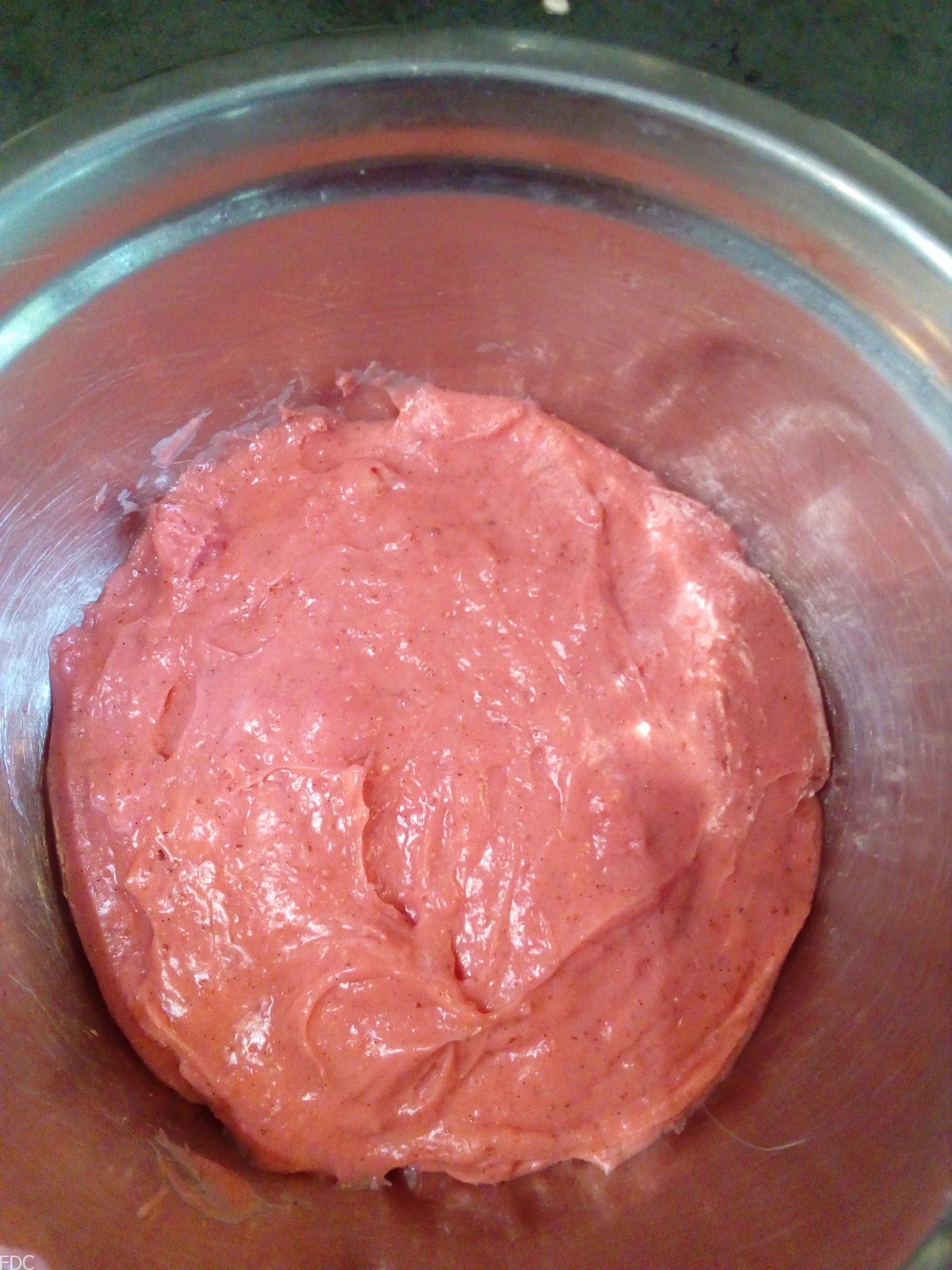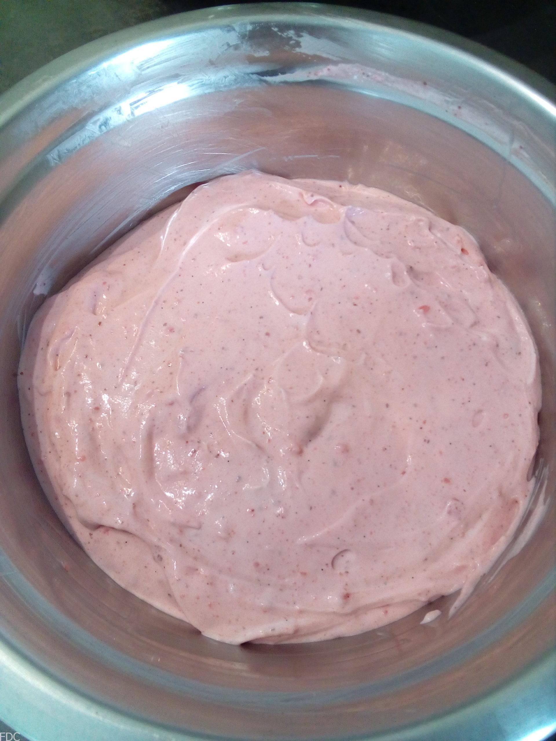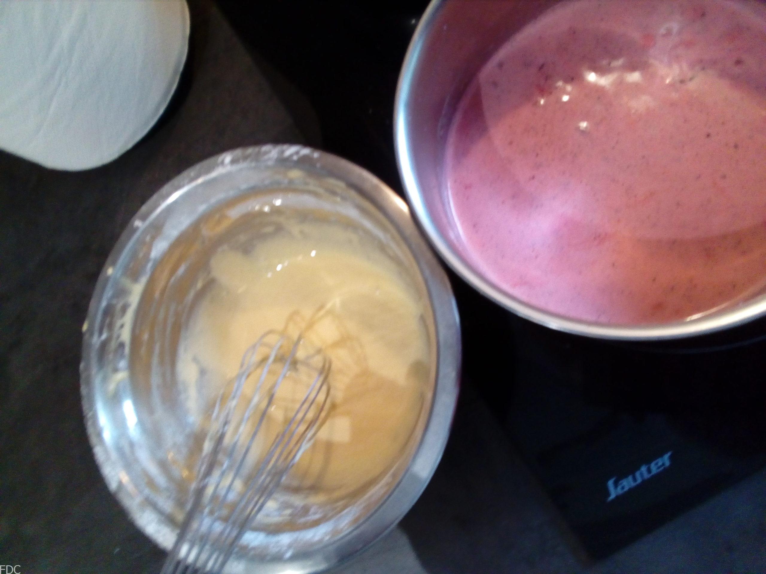 Débarrassez votre pâtissière rose dans le saladier, ajoutez la gélatine, fouettez afin de bien mélanger. Laissez refroidir dehors et ensuite au frais deux à 3 heures, en filmant au contact.