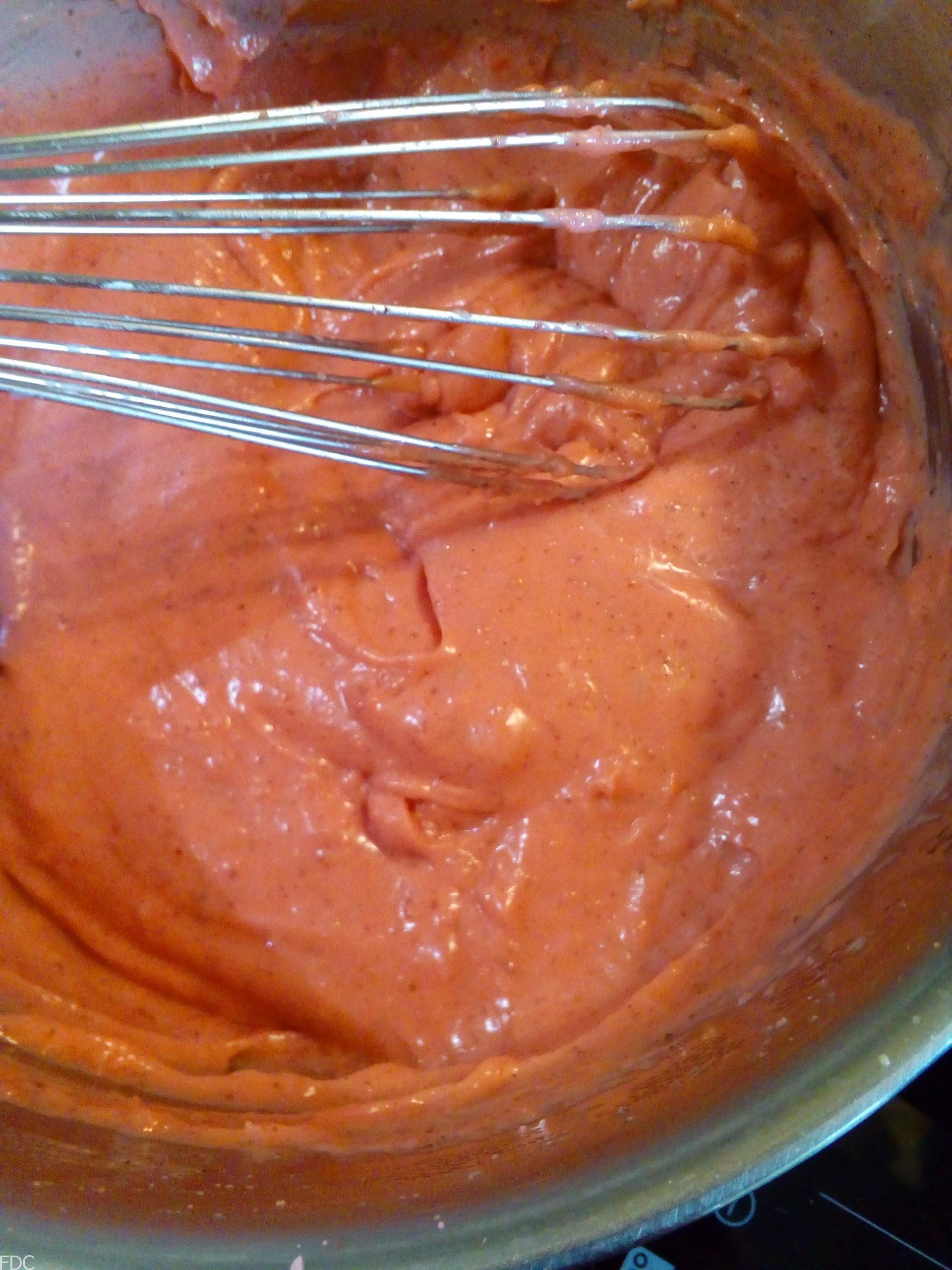 Mettez un tiers du lait dans l’appareil et mélangez. Versez ensuite dans la casserole et remettre à cuire en fouettant partout afin de ne pas faire attacher. Durant 3 à a minutes, l’appareil doit faire quelques bulles et baissez à feu moyen une fois épaissie pour cuire un peu, toujours en évitant que le fond brûle car vous auriez de l’amertume et des morceaux brunis.