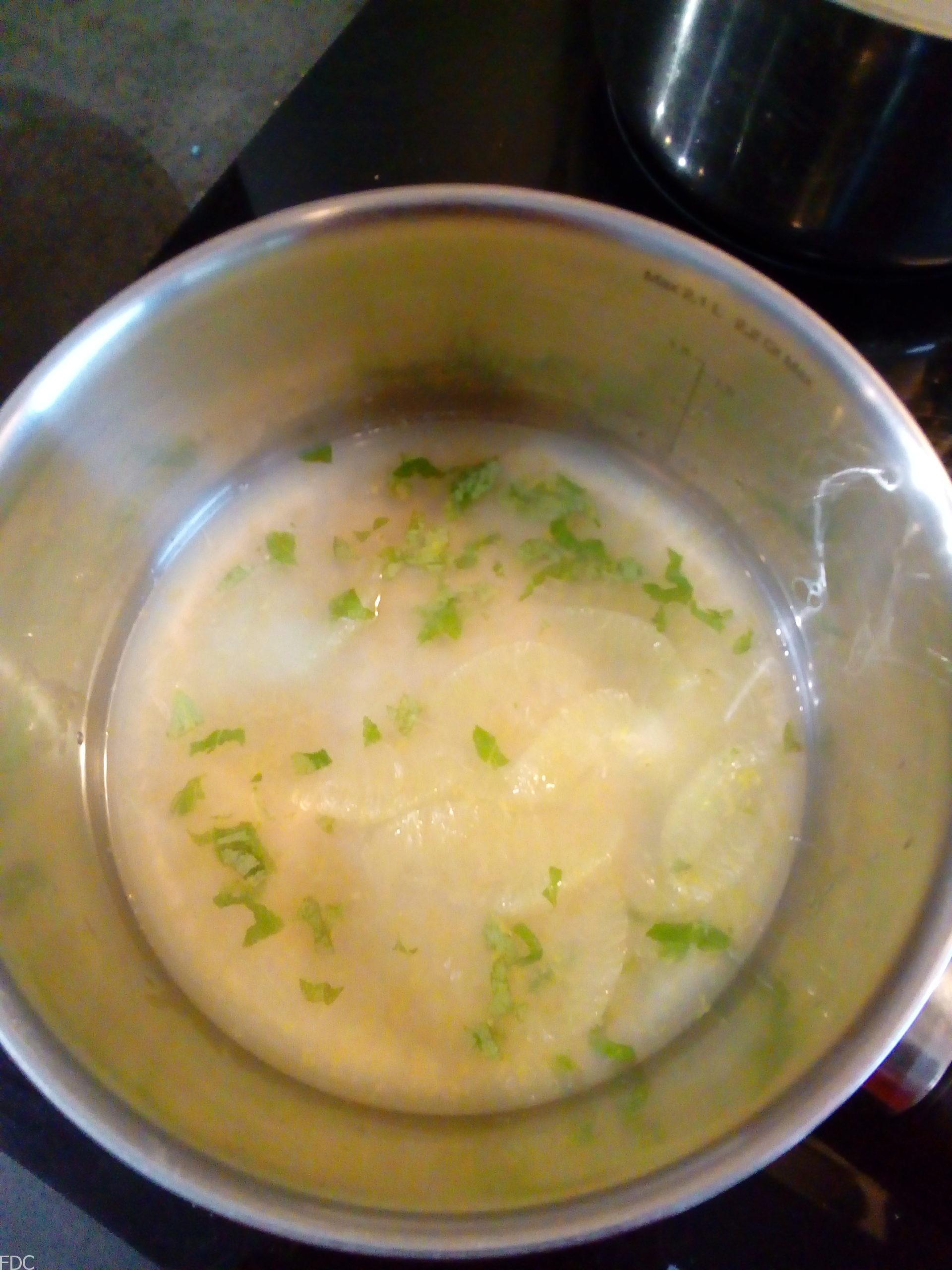 Dans une casserole, mettez le jus de citron (10 cl) + 10 cl d’eau
