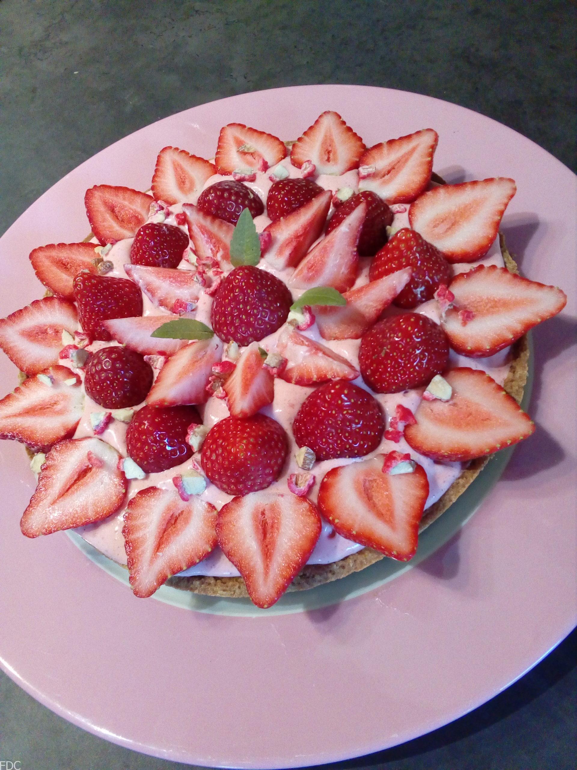 Cette tarte aux fraises sur base de pâte sucrée cache deux appareils. Tout d’abord une gelée de citron avec jus, zestes, suprêmes en morceaux et des feuilles de verveine citronnelle. Ensuite une crème diplomate (pâtissière + crème fouettée) à la praline rose et vanille.