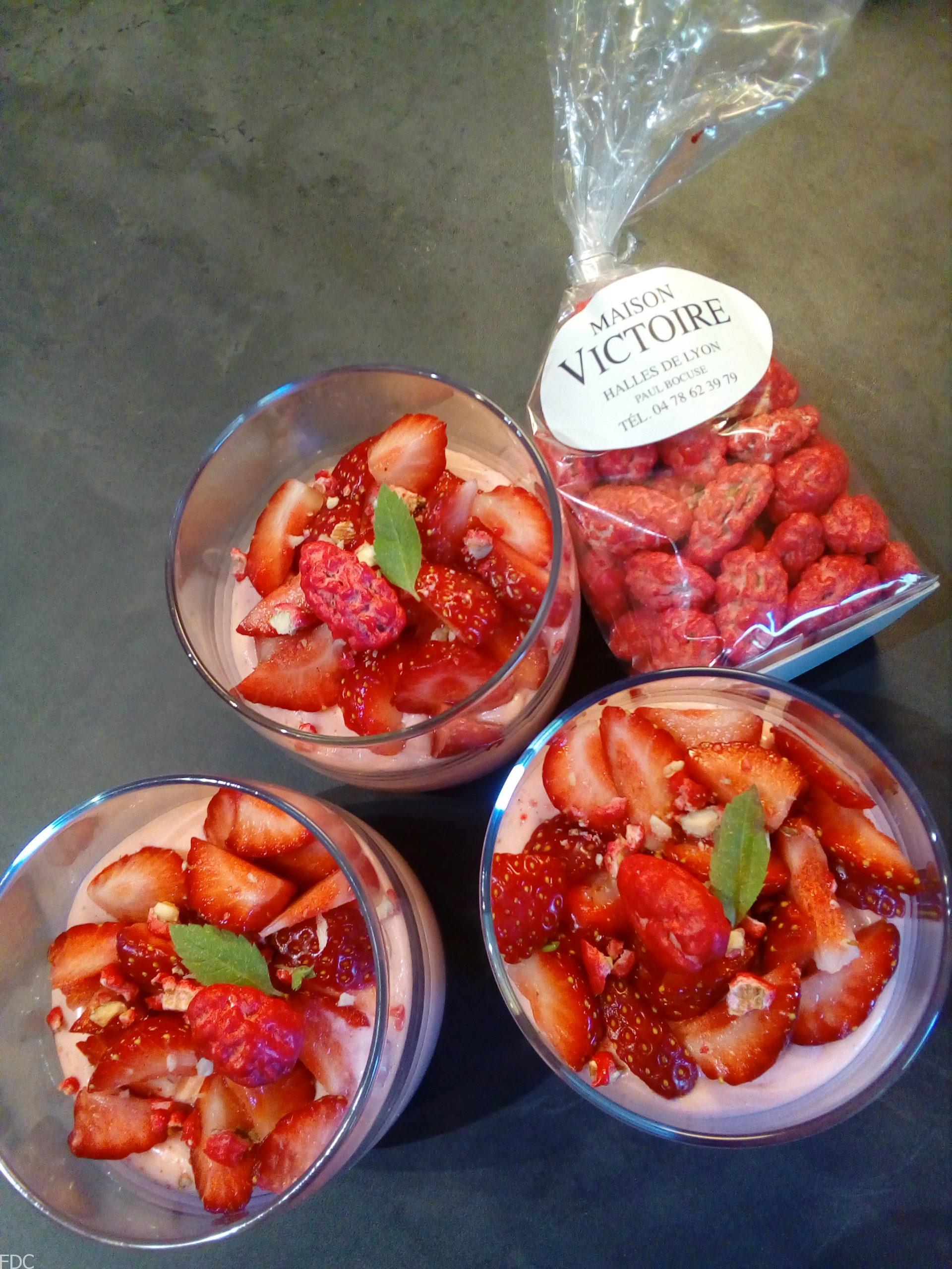 Et pour finir des fraises mûres avec quelques éclats de pralines roses et feuilles de verveine citronnelle.