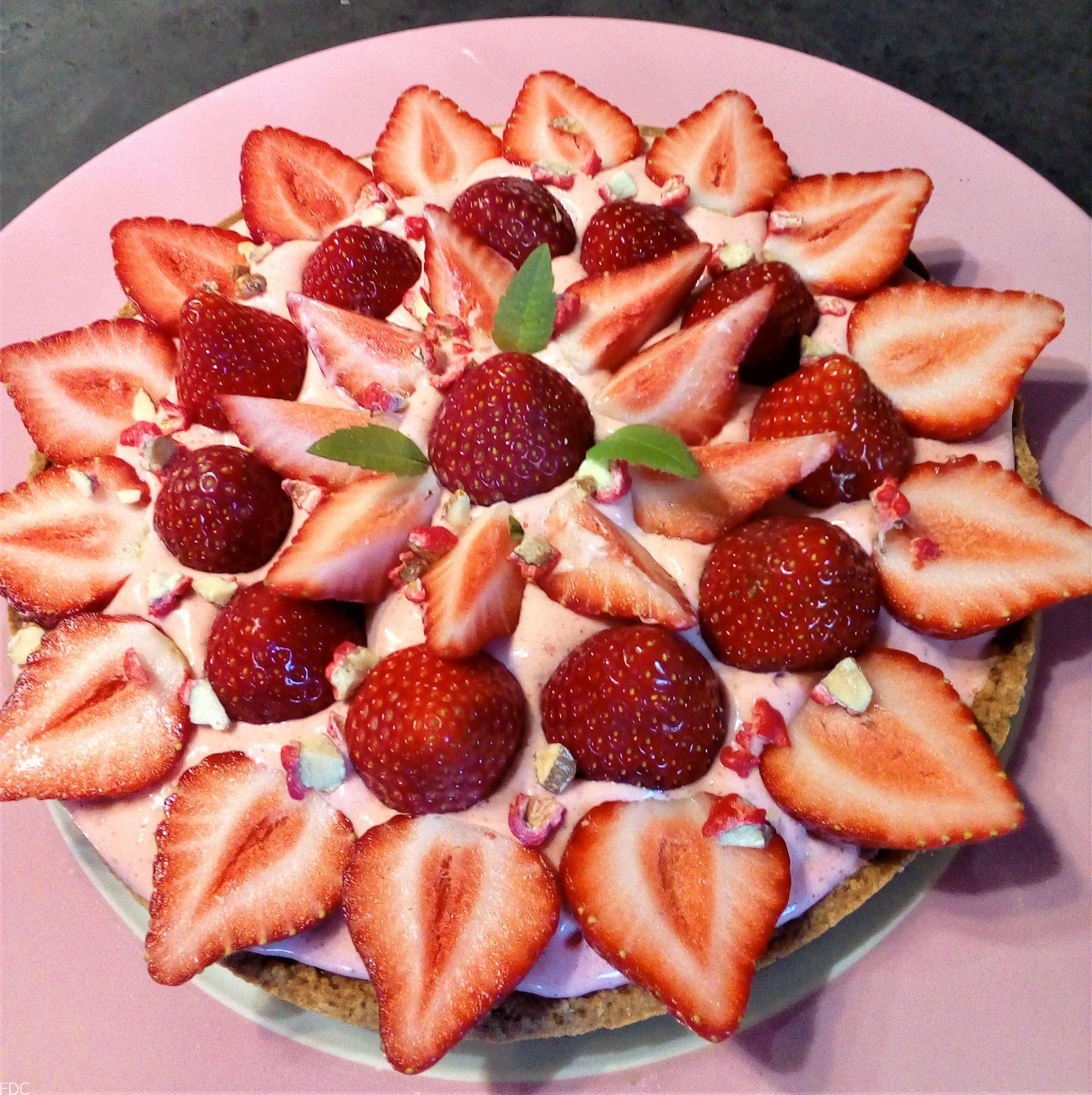Réservez au frais et dégustez la tarte aux fraises et pralines roses avec gourmandises.