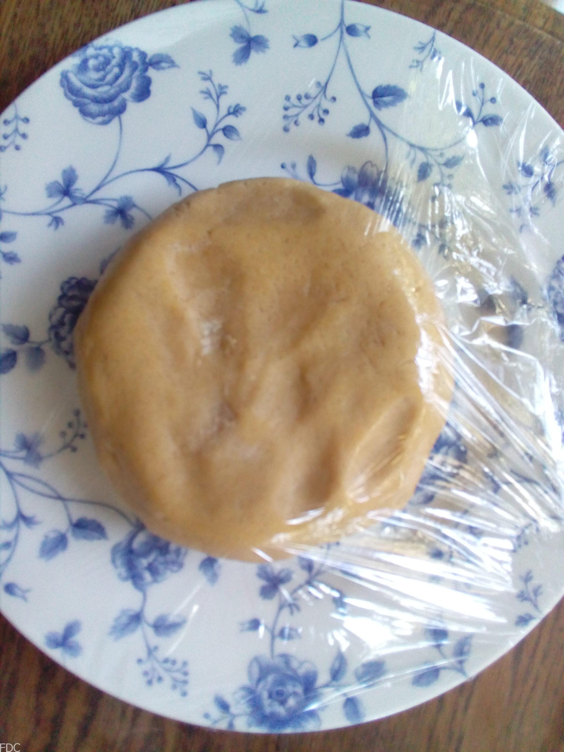 Débarrassez sur votre table de travail et finir le pétrissage en formant une boule aplatie. Réservez entre deux feuilles de papier cuisson. Mettez au froid au minimum 1 heure, mais ça peut se conserver quelques jours. Donc possible de la faire la veille, par exemple, comme la compote.