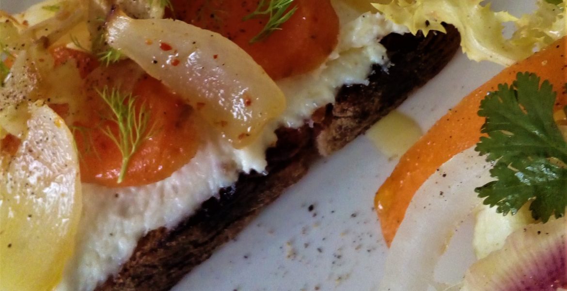 Ma tartine va alterner la douceur, le caractère et un bouquet de saveurs harmonieux et typique du Sud en hiver. Avec des légumes cuits mais croquants, confits pour l’oignon, carotte, fenouil et grillé pour l’ail sur la tartinade et crus sur la salade d’accompagnement.