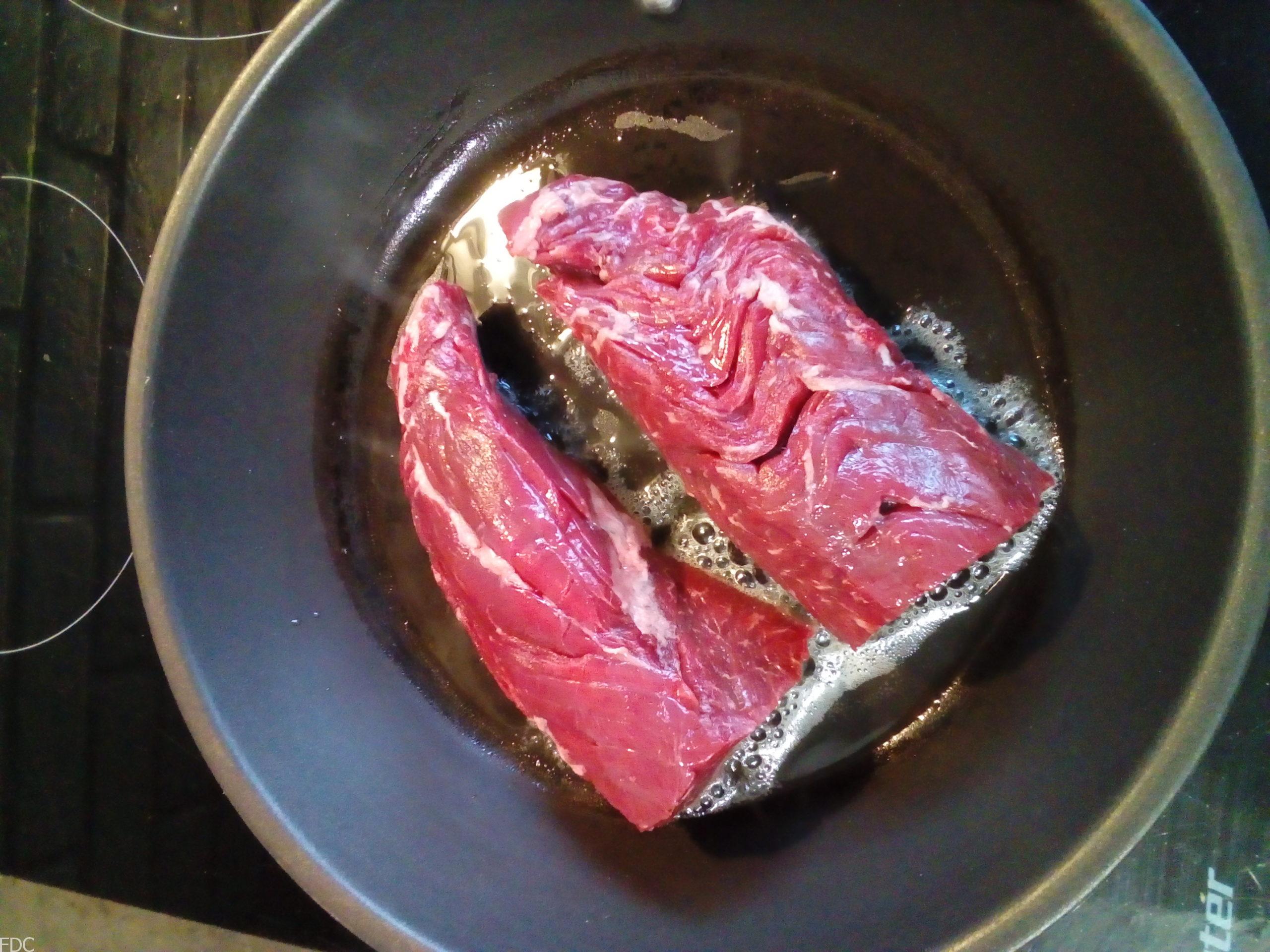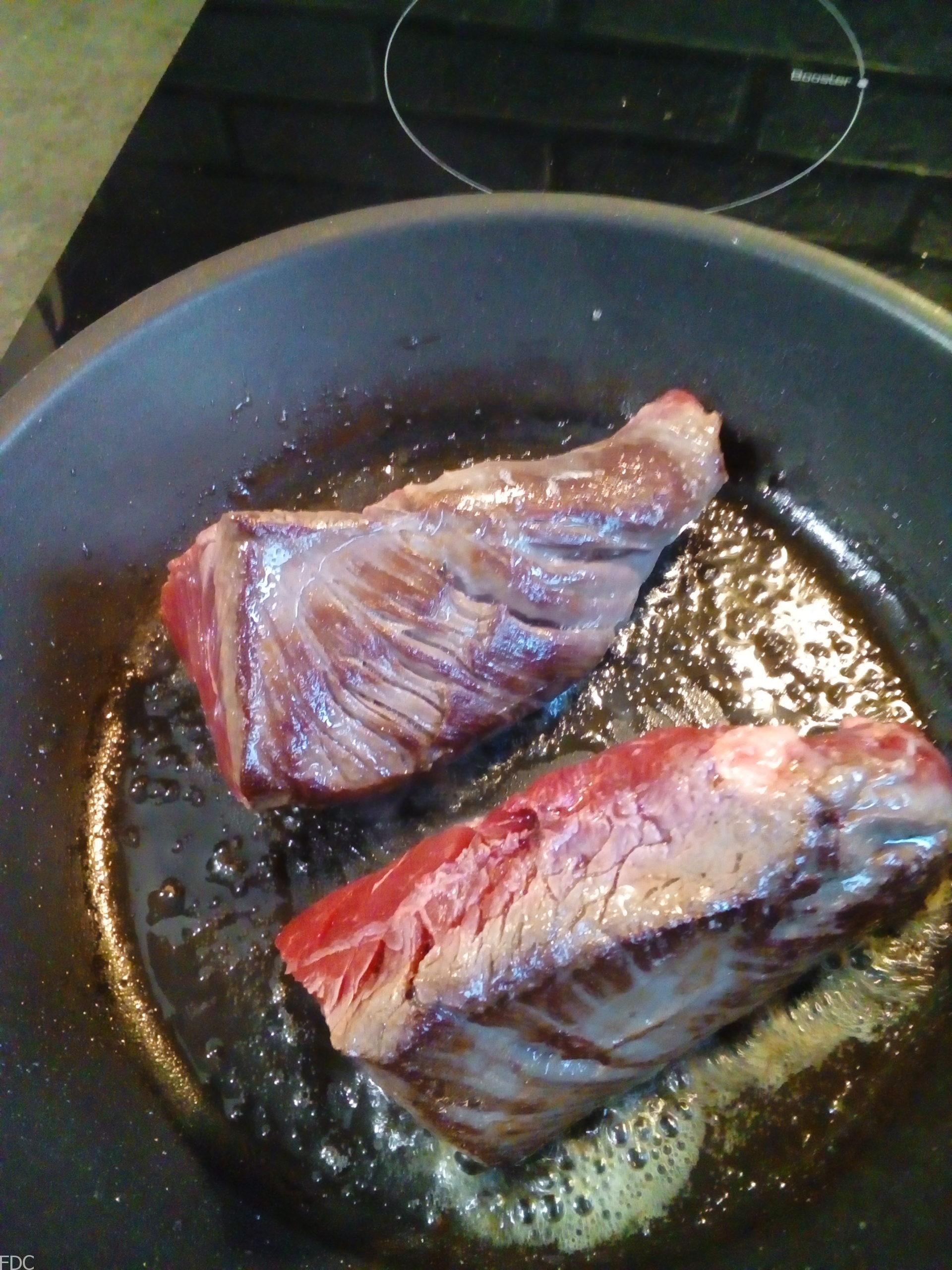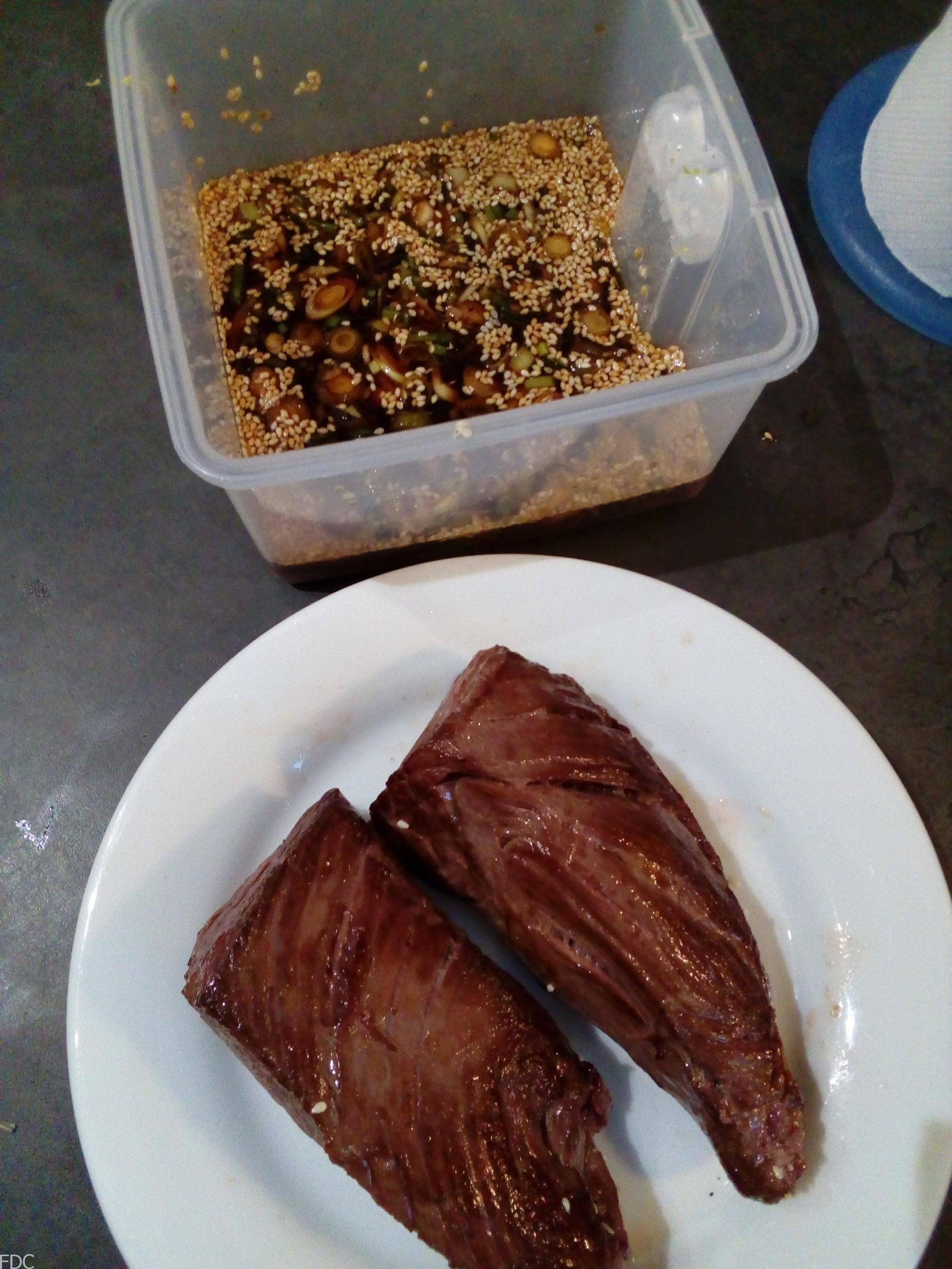 Le Tataki est une méthode de préparation qui s’applique à la viande (bœuf et veau) mais aussi au poisson (thon, saumon ou autre), c’est une forme de carpaccio avec une cuisson brève. Le principe est de saisir (Marquer) et ensuite de mariner quelques heures selon la grosseur. Vous verrez certaines recettes où la viande est marinée avant cuisson brève. Pour ma part j’applique la méthode vue au Japon, saisir la viande en gros morceaux et ensuite mariner deux heures à une nuit. Le fait de bien la saisir avant marinade évite que la marinade à base de sauce soja (très salée) cuise trop la viande et elle pourrait avoir un goût salé trop prononcé. L’objectif est que le cœur soit cru.