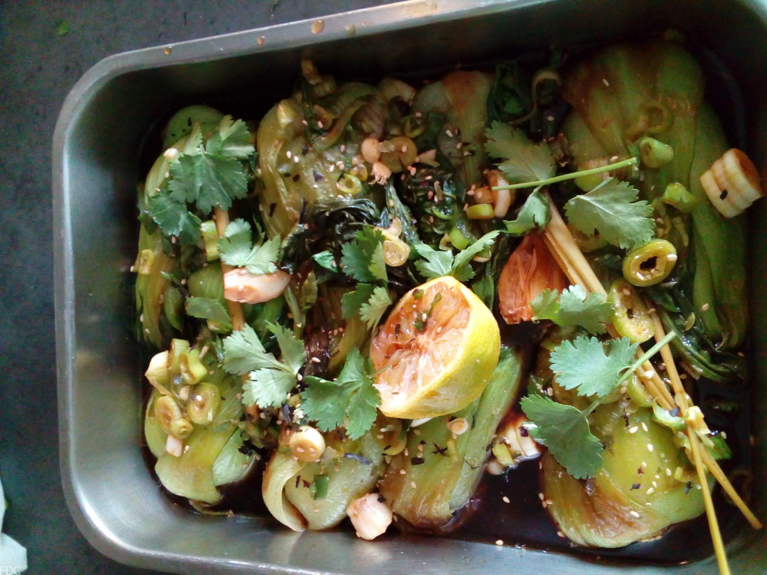 Ajoutez le gingembre râpé, le jus des citrons et un peu de zeste (gardez-en pour le dressage) la citronnelle émincée très finement et la ciboule émincée également.