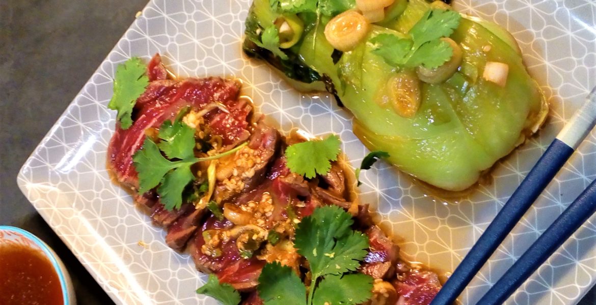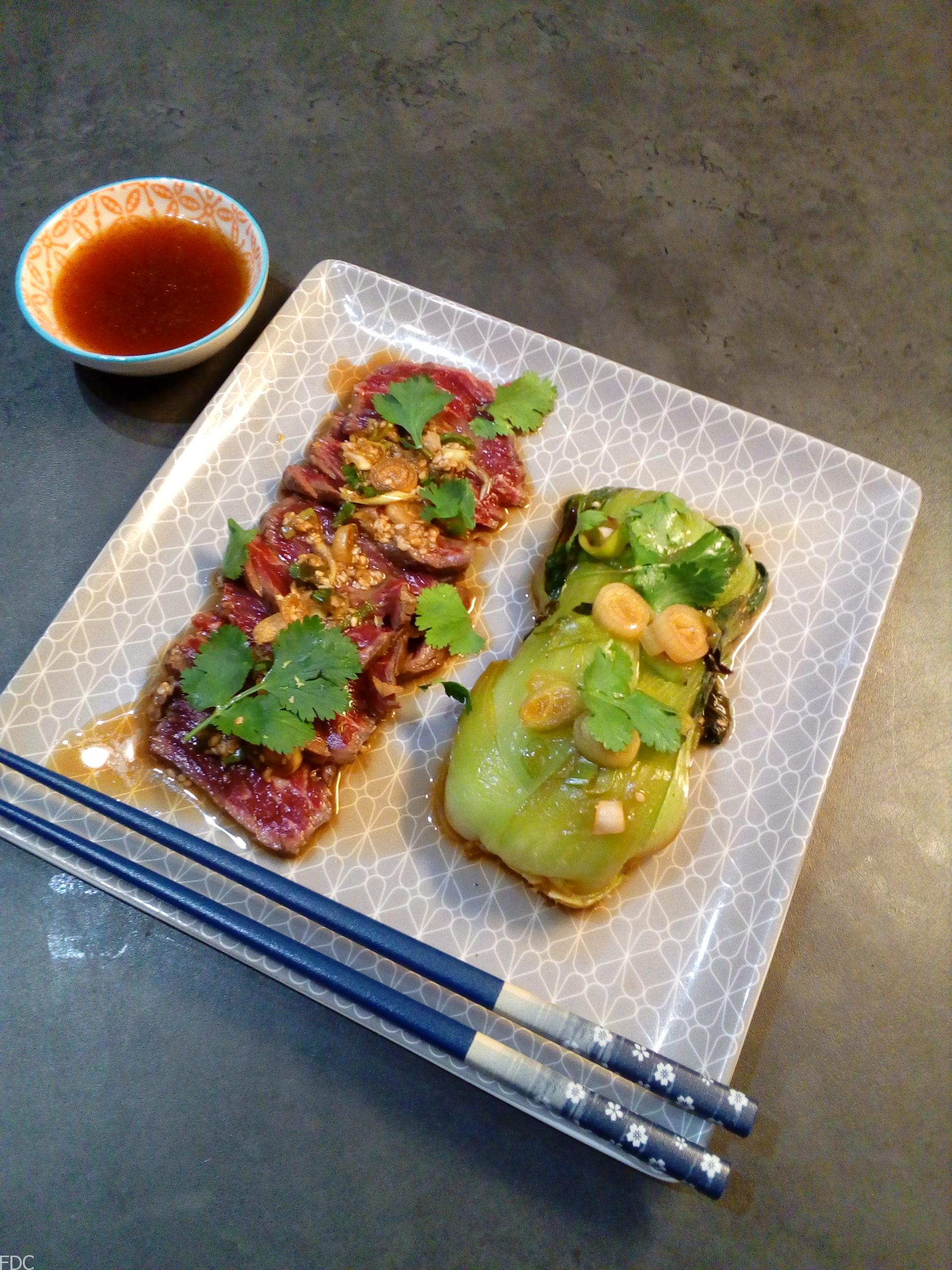 Le Tataki d’onglet de bœuf, je l’accompagne d’un Tataki de chou Pak Choï (recette à suivre séparément ici) mais vous pouvez l’accompagner d’un riz Japonais ou d’une salade Japonaise de préférence ?